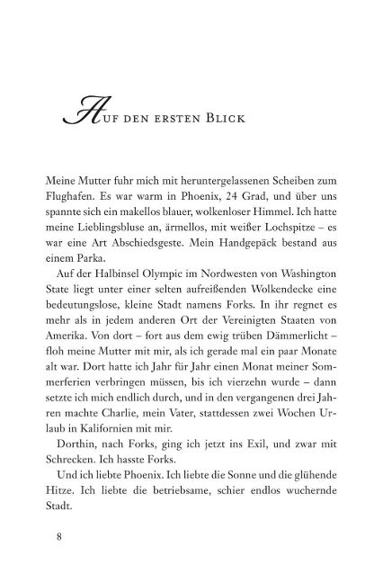 Als die 17-jährige Bella Swan aus dem sonnigen Phoenix ins regnerische Forks zieht, erwartet sie wenig von der beschaulichen Kleinstadt. Doch dann trifft sie Edward Cullen, einen Mitschüler mit faszinierend blassen Augen und einer Aura, die Bella sofort in ihren Bann zieht. Edward ist geheimnisvoll, zurückhaltend, unglaublich attraktiv - und ein Vampir! Bella kann nicht anders: Sie fühlt sich trotz - oder vielleicht gerade wegen - seiner dunklen Geheimnisse zu ihm hingezogen. Doch was bedeutet es, als Mensch einen Vampir zu lieben?