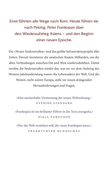 Die Seidenstraßen, die den fernen Osten mit Europa verbanden, waren vor dem Aufstieg des Westens jahrhundertelang die Lebensadern der Welt - und genau das werden sie, wie Peter Frankopan zeigt, auch in Zukunft wieder sein. Die asiatischen Staaten investieren derzeit Milliarden, um die neuen Seidenstraßen zu errichten, und an diesen liegen die Orte, wo künftig die Weichen der globalen Entwicklung gestellt werden: Peking, Delhi, Islamabad, Riad, Moskau. Asien rückt zusammen und drängt immer entschiedener nach Westen. Doch was bedeutet das für uns? Mit der Weitsicht des Globalhistorikers und dem Scharfsinn des politischen Analysten führt uns Frankopan vor Augen, was wir gerade erleben: die Entstehung einer neuen Welt und den Beginn einer neuen Epoche.
