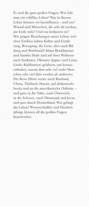 Es sind die ganz großen Fragen: Wie lebt man ein erfülltes Leben? Was in diesem Leben können wir beeinflussen - und wie? Worauf sind Menschen, die sehr alt werden, am Ende stolz? Und was bedauern sie? Wie prägen Beziehungen unser Leben, welchen Einfluss haben Kultur und Ernährung, Bewegung, die Gene, aber auch Bildung und Wohlstand? Klaus Brinkbäumer und Samiha Shafy sind auf ihrer Weltreise nach Sardinien, Okinawa (Japan) und Loma Linda (Kalifornien) gefahren, um herauszufinden, warum dort sehr viel mehr Menschen sehr viel älter werden als anderswo. Die Reise führte weiter nach Russland, China, Thailand, Hawaii, auf afrikanische Inseln und an die amerikanische Ostküste - und ganz in die Nähe, nach Österreich, in die Schweiz, nach Dänemark und kreuz und quer durch Deutschland. Wie gelingt das Leben? Wissenschaftler und Hundertjährige können all die großen Fragen beantworten.