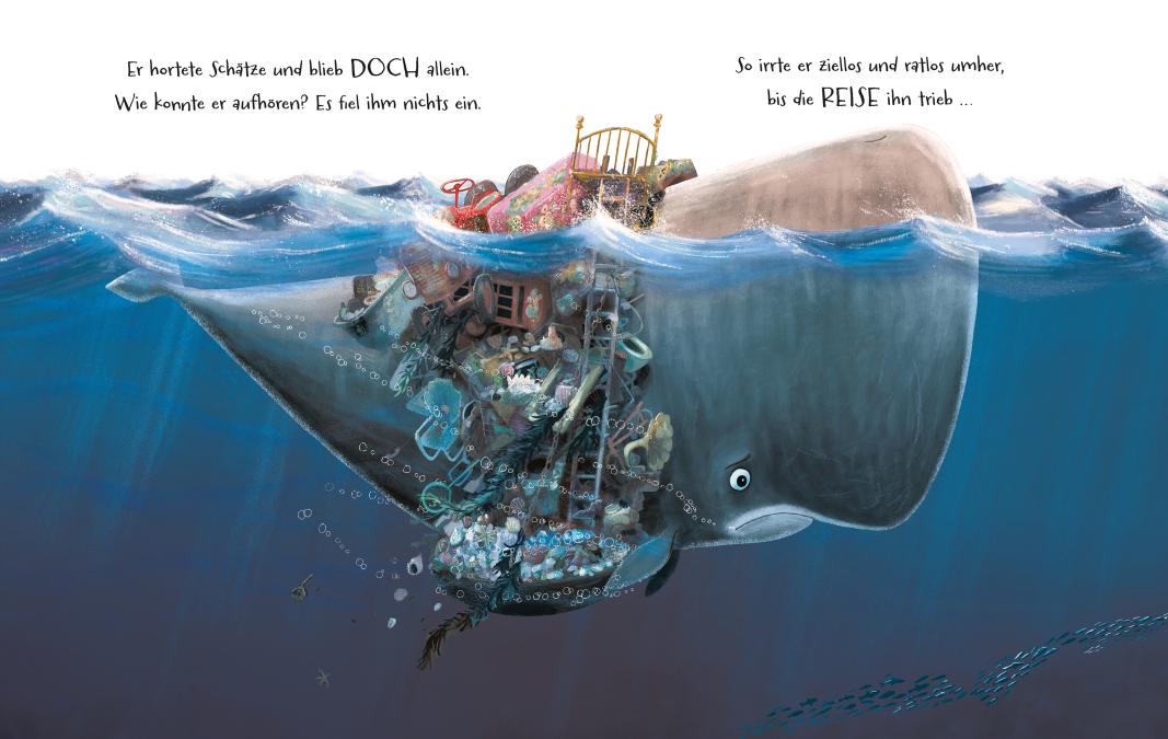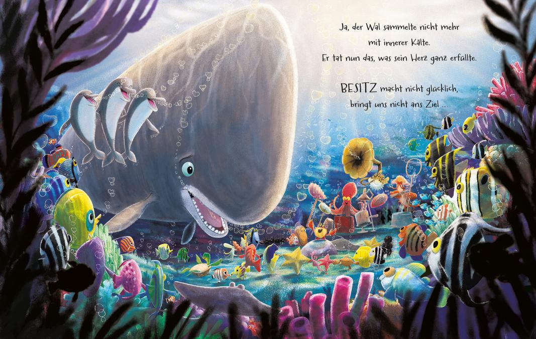 In den Weiten des grau-grünen Ozeans zieht ein junger Wal seine einsamen Bahnen, immer auf der Suche nach einer neuen Kostbarkeit, die ihn glücklich machen könnte. Doch egal, wie viele Schätze er anhäuft, Wendelin ist nie zufrieden. Doch dann erinnert er sich an das Lied seiner Mama, und plötzlich ist sein Herz offen und weit. Nicht funkelnde Dinge sind es, die seine Sehnsucht stillen, sondern echte Freundschaft und Verbundenheit.