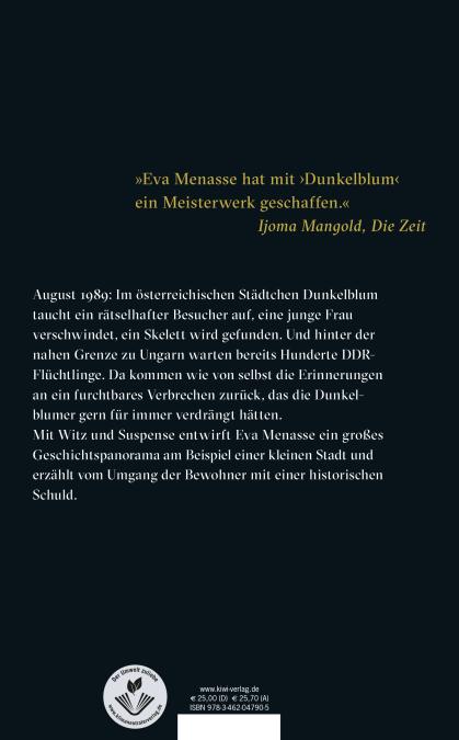 Auf den ersten Blick ist Dunkelblum eine Kleinstadt wie jede andere. Doch hinter der Fassade der österreichischen Gemeinde verbirgt sich die Geschichte eines furchtbaren Verbrechens. Ihr Wissen um das Ereignis verbindet die älteren Dunkelblumer seit Jahrzehnten - genauso wie ihr Schweigen über Tat und Täter. In den Spätsommertagen des Jahres 1989, während hinter der nahegelegenen Grenze zu Ungarn bereits Hunderte DDR-Flüchtlinge warten, trifft ein rätselhafter Besucher in der Stadt ein. Da geraten die Dinge plötzlich in Bewegung: Auf einer Wiese am Stadtrand wird ein Skelett ausgegraben und eine junge Frau verschwindet. Wie in einem Spuk tauchen Spuren des alten Verbrechens auf - und konfrontieren die Dunkelblumer mit einer Vergangenheit, die sie längst für erledigt hielten. In ihrem neuen Roman entwirft Eva Menasse ein großes Geschichtspanorama am Beispiel einer kleinen Stadt, die immer wieder zum Schauplatz der Weltpolitik wird, und erzählt vom Umgang der Bewohner mit einer historischen Schuld. »Dunkelblum« ist ein schaurig-komisches Epos über die Wunden in der Landschaft und den Seelen der Menschen, die, anders als die Erinnerung, nicht vergehen.