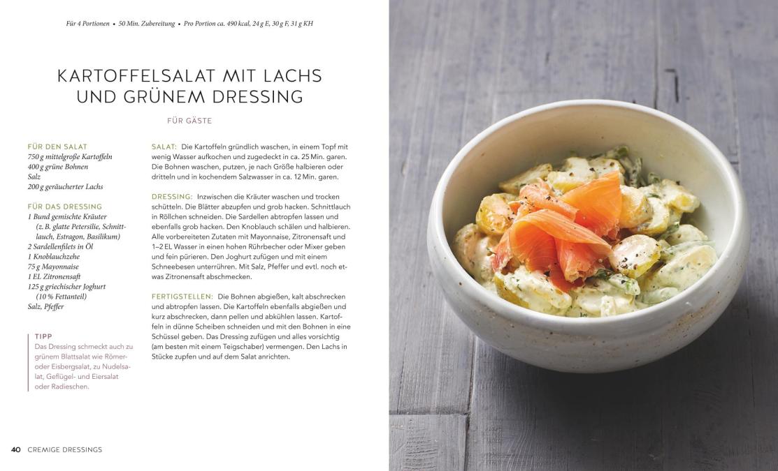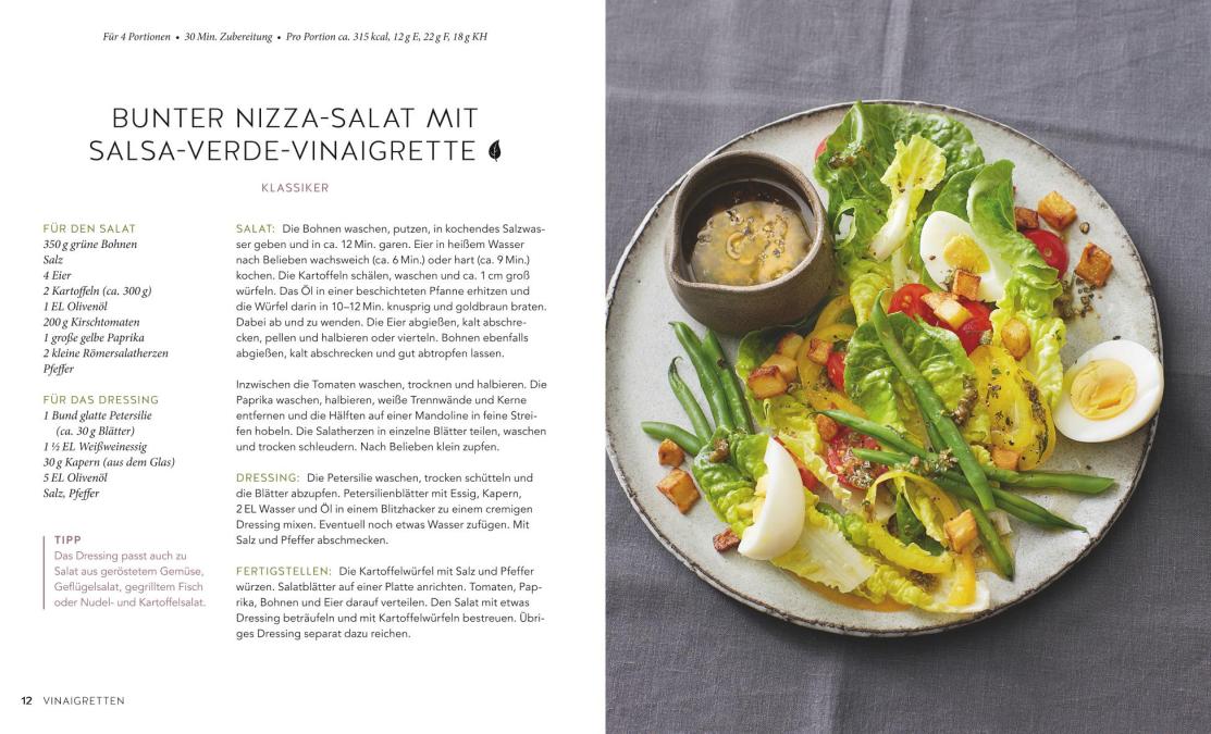 Jeden Tag ein anderer Style! Was in der Mode der neue Dress, schafft beim Salat das neue Dressing: Die Zutaten werfen sich damit so richtig in Schale und wirken ganz schnell wie verwandelt. Mit den Rezepten und Tipps des GU-KüchenRatgebers 1 Salat – 50 Dressings lassen sich Salatköpfe jetzt überraschend vielseitig herausputzen, von klassisch bis knackig, mild bis fruchtig und feinsäuerlich bis vegan. Ein Kapitel widmet sich neuen Vinaigrette-Variationen, eines ist für cremige Salatsaucen reserviert und eines führt außergewöhnliche Kombis vor, mal asiatisch, mal orientalisch inspiriert – oder auch süß, denn auch Obstsalate brauchen ein aromatisches Update! Trendige Zutaten mischen bei vielen Rezepten mit – von Avocado bis Zitrusfrucht, von Mango bis Tahini. Granatapfel-Vinaigrette, Miso-Ahorsirup-Dressing, aber auch Rezepte für Klassiker wie Ranch- oder Thousand-Island-Dressing machen schnell klar: Die neue Salatmode ist leicht, vielseitig und ganz fix prêt-à-manger!