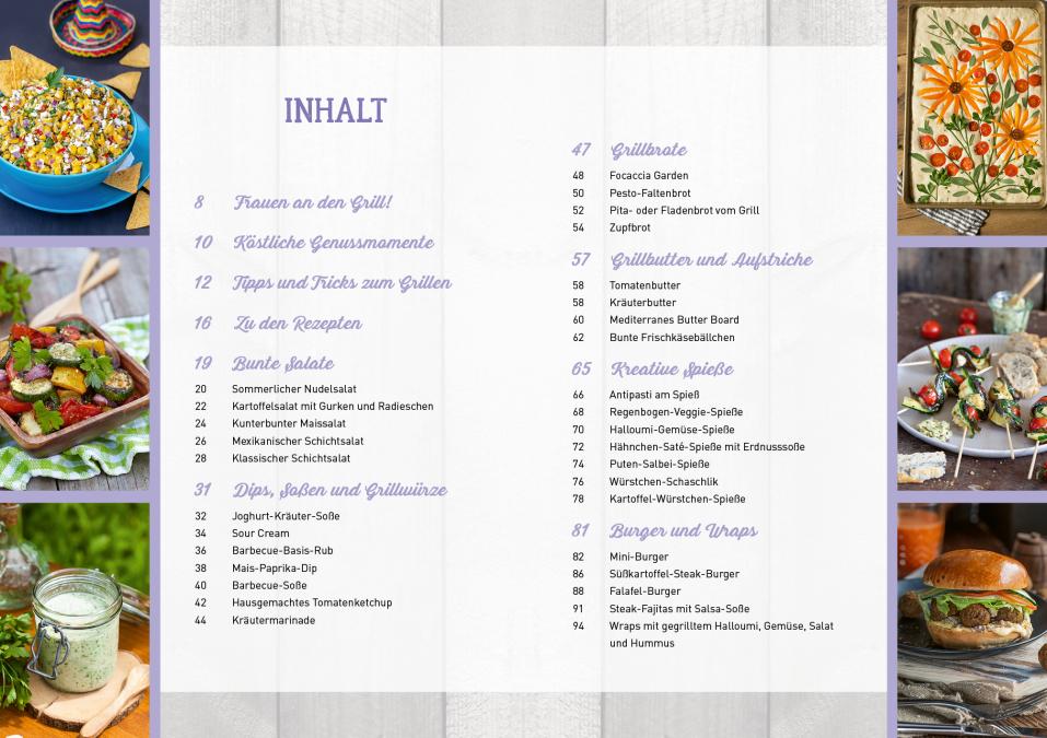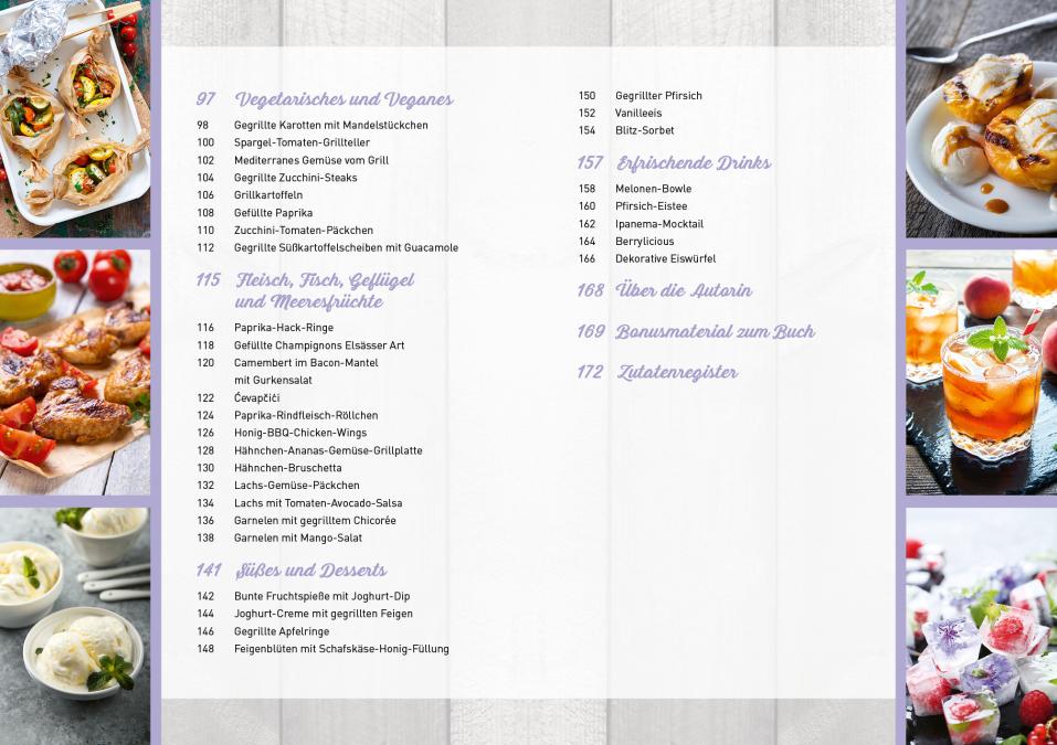 Neben den Köstlichkeiten vom Grill finden Sie auch abwechslungsreiche Rezepte für das gesamte Grillbüfett. Mit dabei sind vielseitige Nudel- und Schichtsalate, raffinierte Dips, Grillbutter, Grillbrote und -brötchen und sogar Drinks und Cocktails mit und ohne Alkohol. Von Klassikern bis hin zu ausgefallenen Rezeptideen, egal ob leicht, würzig oder fruchtig: Hier werden alle fündig.