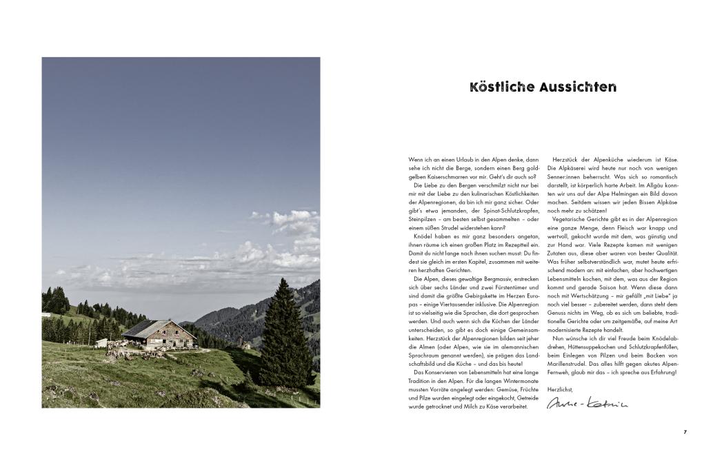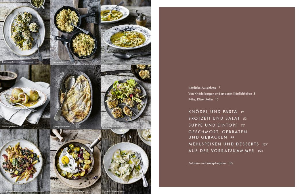 In über 70 vegetarischen Rezepten und stimmungsvollen Fotos nimmt die Autorin alle Kochbegeisterten mit auf eine kulinarische Entdeckungsreise. Los geht’s mit herzhaften Knödeln oder einer kräuterduftenden Pasta. Es folgt eine zünftige Brotzeit, eine cremige Suppe oder ein würziges Käsefondue. Bei den süßen Schmankerln fällt die Wahl angesichts all der herrlichen Mehlspeisen wie Topfenpalatschinken, Germknödel und Marillenstrudel schwer. Für die Vorratskammer empfiehlt die Autorin Bärlauch-Kapern, Bergkräutersirup, eingelegte Pilze und weitere Köstlichkeiten aus den Schätzen der Natur.