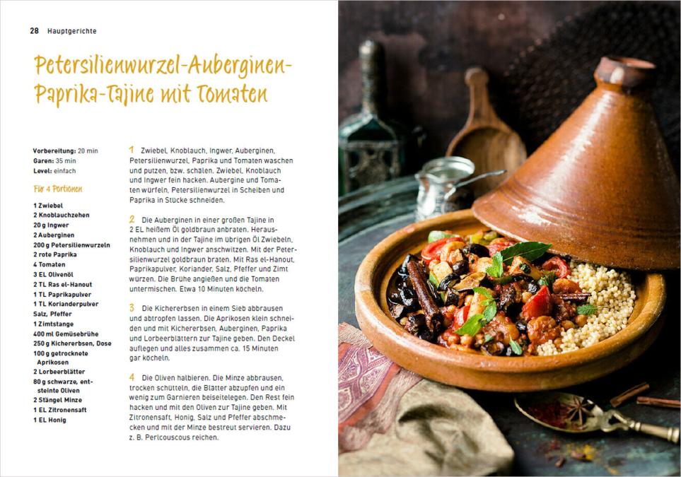 Tajine ist sowohl der Name dieses wunderschönen Gefäßes als auch der darin zubereiteten aromatischen Schmorgerichte. Durch das schonende Garen im eigenen Saft bei niedrigen Temperaturen entstehen intensive Aromen, die diese One-Pot-Meals so unglaublich lecker machen. Auf Fett kann dabei verzichtet werden. Köstlich gewürzt, Vorspeisen, Hauptgerichte und Desserts, mit Kichererbse, Aubergine, Möhre, Granatapfel, Dattel, Aprikosen und mehr. Wer fettarme, gesunde, aroma- und geschmacksintensive Essen mag, dem bietet dieses Buch abwechslungsreiche und innovative vegetarische Rezepte, ohne Fisch und Fleisch.