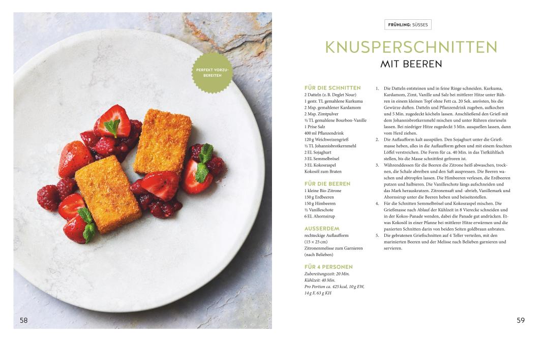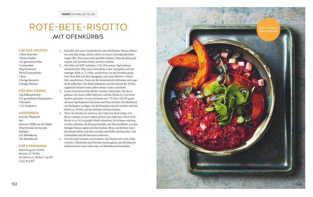 Der Hauptteil des Buches setzt sich aus herzhaften Mahlzeiten fürs Mittagessen und Abendessen zusammen. Es gibt vegane Salate, Suppen, Currys, Bratlinge, aber auch Pasta, überbackenes Gemüse und Bowls. Freuen Sie sich auf:
