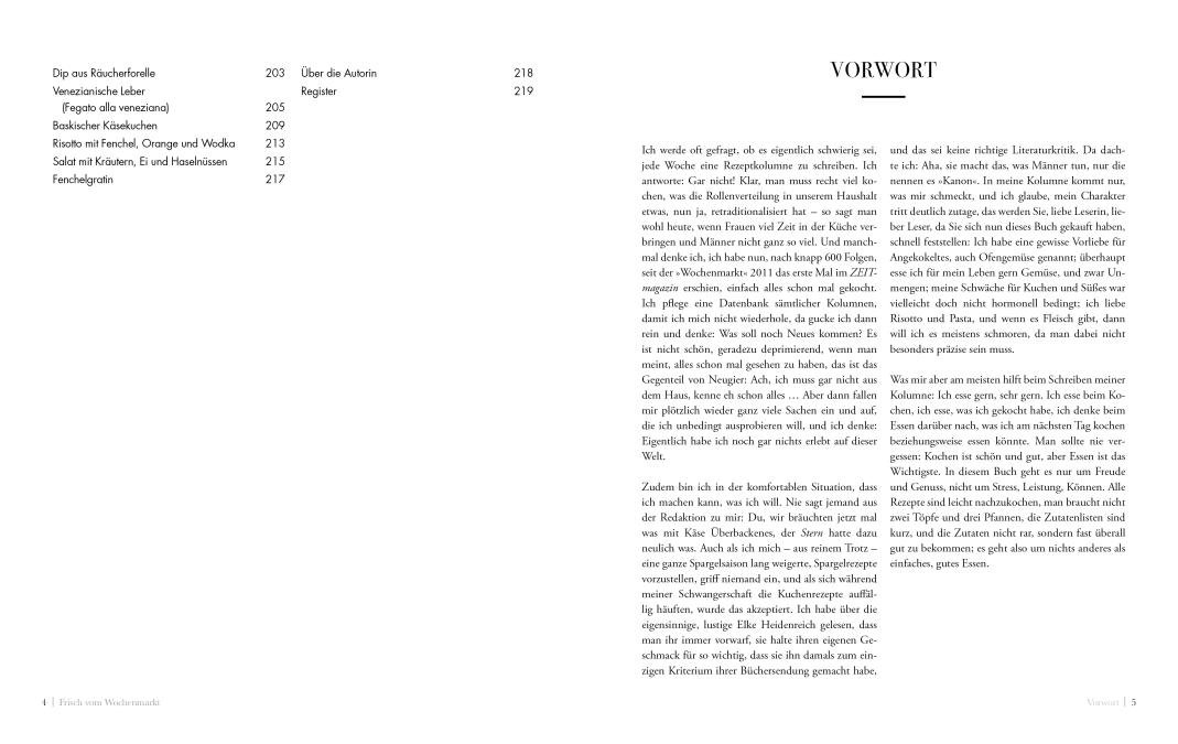 Einfach, leicht nachzukochen, mit frischen saisonalen Zutaten, und doch immer mit dem gewissen Etwas – das sind die Rezepte der Kochkolumne »Wochenmarkt« im ZEITmagazin. Im Frühling serviert Elisabeth Raether einen frischen Salat mit Kräutern, Ei und Haselnüssen, im Sommer Parmigiana di zucchine, der Herbst bringt einen überraschend simplen Apfelkuchen aus der Pfanne, und im Winter verleiht ein Blauschimmel-Dip der Süßkartoffel den besonderen Dreh.
