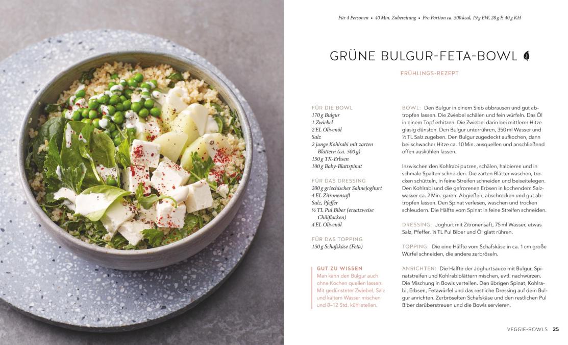 grüne Bulgur-Feta-Bowl für den Frühling orangefarbene Hirse-Bowl mit orientalischem Touch gelbe Quinoa-Bowl mit Röst-Rosenkohl kunterbunte Kürbis-Couscous-Bowl für den Herbst