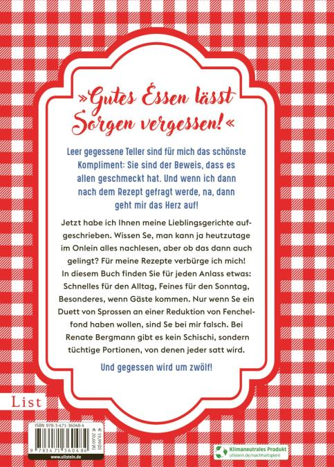 Endlich veröffentlicht Renate Bergmann ein Kochbuch! Es versammelt die besten Hausmannskost-Rezepte, Schnelles für den Alltag und Besonderes für den Sonntag, aber auch Leckeres für Vegetarier und Veganer (wenn Kirsten zu Besuch kommt) und Häppchen für das kalte Buffet. Ein Extra-Kapitel für Bowle, Punsch und andere lustige Getränke darf natürlich nicht fehlen! Und jede Menge toller Tipps und Tricks für die Küche.