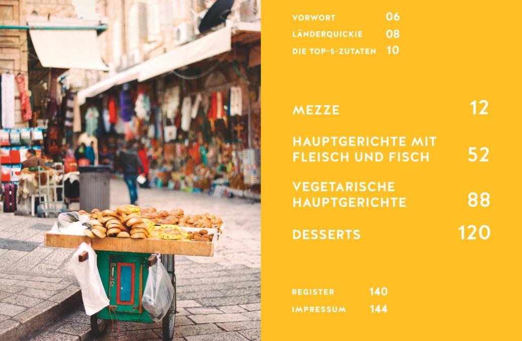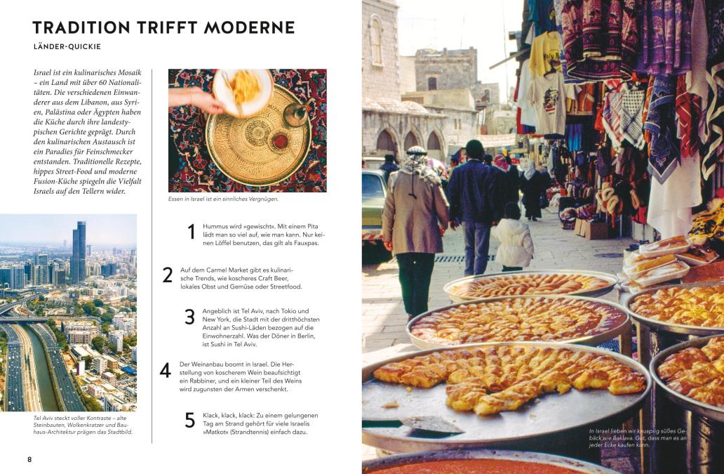 Die israelische Küche - vielfältig, aromatisch und ständig im Wandel. Geprägt durch Einflüsse aus allerlei Ländern ist sie ein kulinarischer Schmelztiegel, der immer wieder mit neuen Gerichten überrascht. Die pulsierende Food-Szene in Tel Aviv und die traditionelle Küche in Jerusalem verschmelzen in Stav Cohens Wohlfühlrezepten. Die Israelin zaubert unkomplizierte Gerichte für Koch-Neulinge und Israel-Fans, bei denen einem bereits beim Lesen das Wasser im Mund zusammenläuft. Frisches Gemüse, Fisch, Fleisch, Hülsenfrüchte und Gewürze vereinen sich in Kochen wie in Israel zu einem Geschmacksabenteuer, das seinesgleichen sucht. Von Falafel oder Sabich bis zu Hummus und Shakshuka ist für jeden Foodie etwas dabei. Das Geheimnis: Die Autorin kocht die besten Gerichte aus ihrer Heimat - aber mit Zutaten, die man auch hierzulande überall bekommt. Und wer vom Brutzeln und Schlemmen eine Pause benötigt, der kann in Bildstrecken schwelgen, die das lebhafte Israel zeigen.