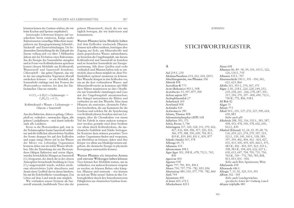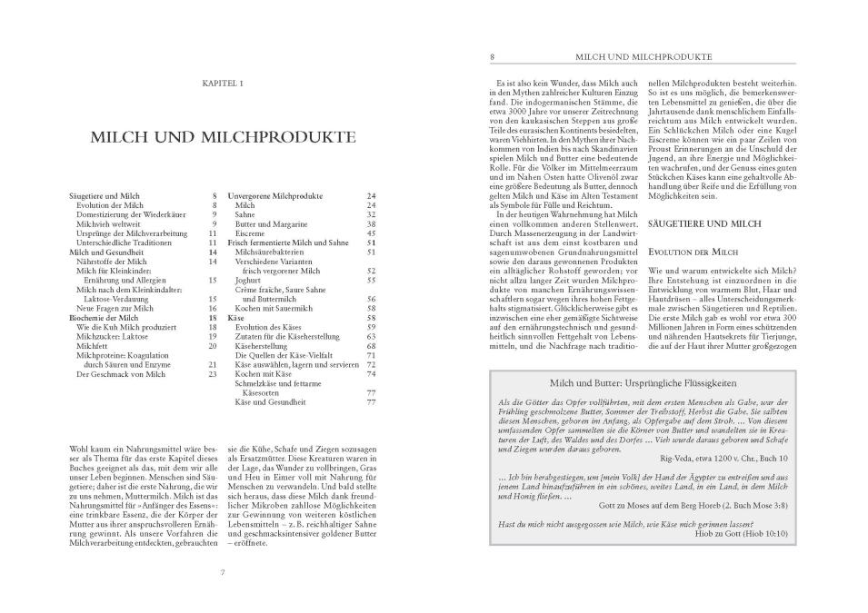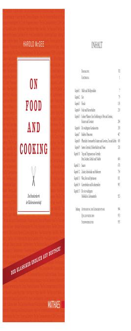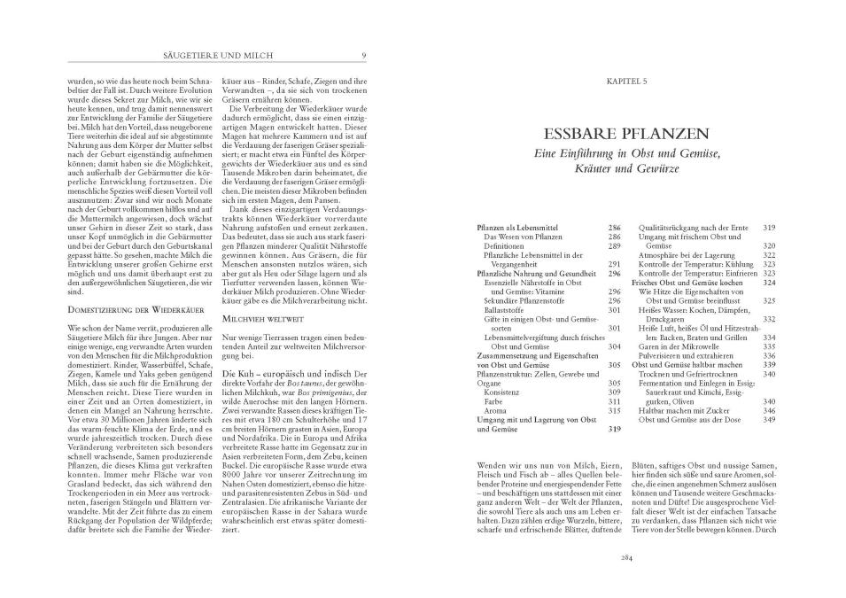• Milch und Milchprodukte• Eier• Fleisch• Fisch und Meeresfrüchte• Essbare Pflanzen: Eine Einführung in Obst und Gemüse, Kräuter und Gewürze• Die wichtigsten Gemüsesorten• Beliebte Obstsorten• Pflanzliche Aromastoffe: Kräuter und Gewürze, Tee und Kaffee• Samen: Getreide, Hülsenfrüchte und Nüsse• Teig und Teigmassen aus Getreide: Brot, Kuchen, Gebäck und Nudeln• Saucen• Zucker, Schokolade und Süßwaren• Wein, Bier und Spirituosen• Garmethoden und Kochutensilien• Die vier wichtigsten Moleküle in Lebensmitteln