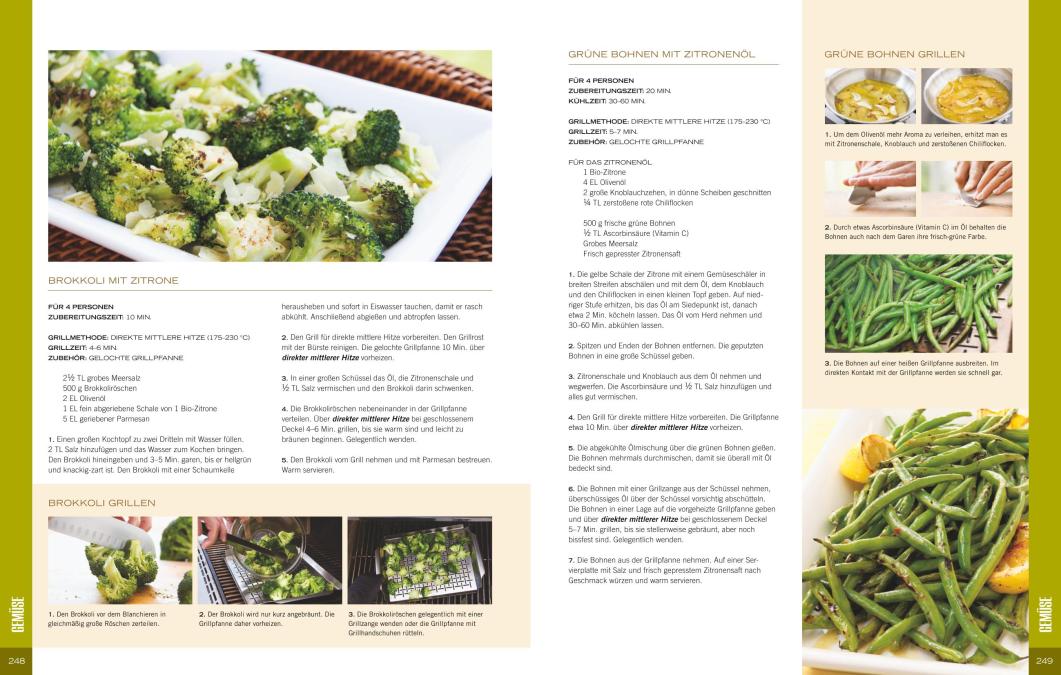 Ribeye-Steaks mit Olivenkruste Lammspieße mit Zaziki Rotweinburger mit Rosmarin-Focaccia Baby-Back-Ribs mit Ingwer-Soja-Glasur Schweinefilets mit Rauchpaprika-Rouille Bierdosen-Hähnchen im Hickory-Rauch gegart Entenkeulen vom Grill Louisiana-Garnelensandwich mit kreolischer Remoulade Lachs vom Zedernholzbrett Goldmakrele mit Mais-Champignon-Gemüse Maiskolben mit Zitronen-Curry-Butter Pizza mit gegrilltem Gemüse und geräuchertem Mozzarella Grüner Spargel mit Schinken und Zitronenvinaigrette Karamelläpfel auf Blätterteig Banana S’Mores