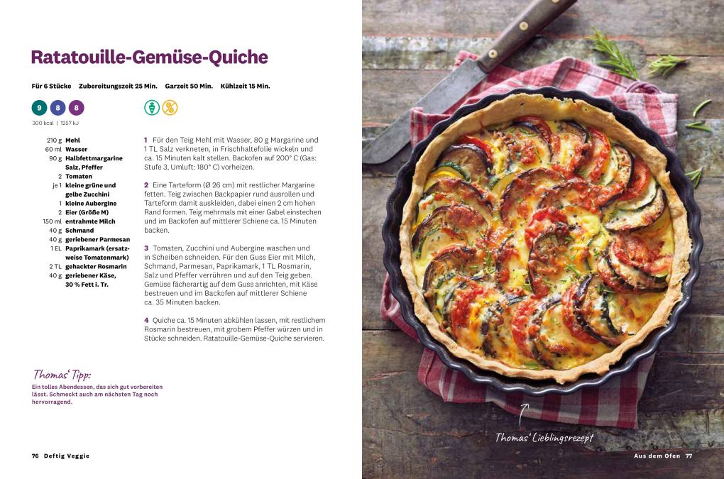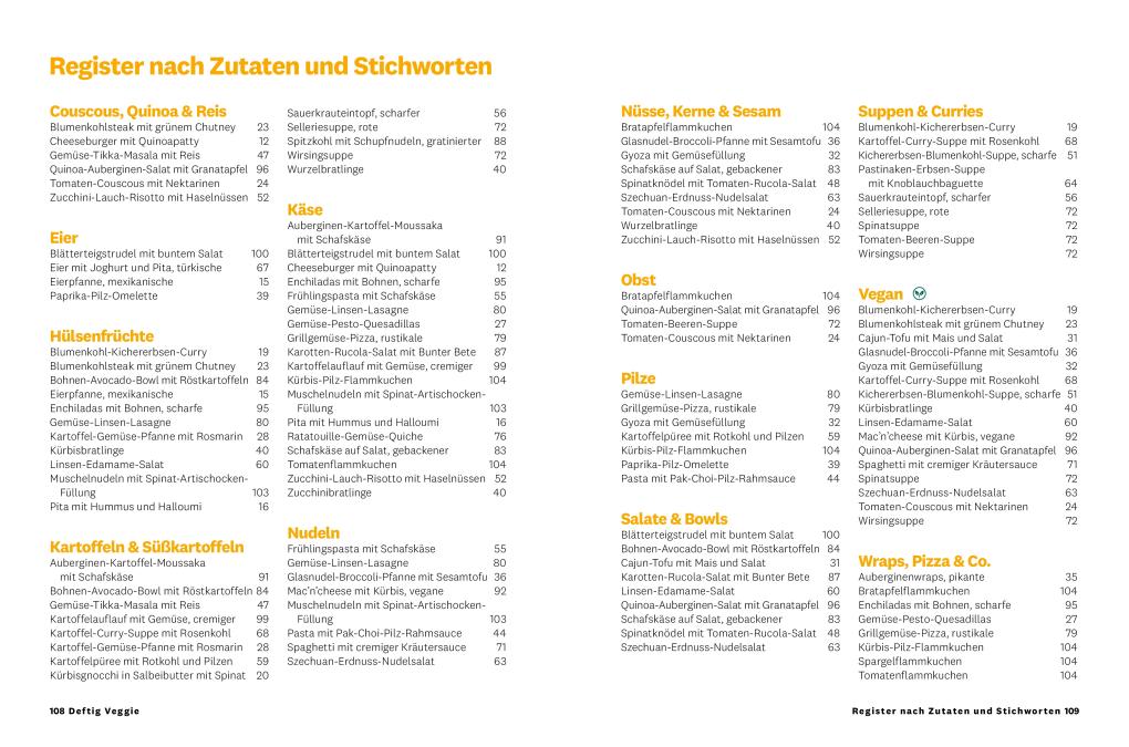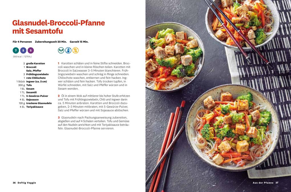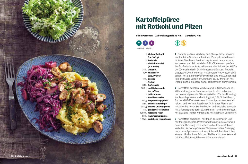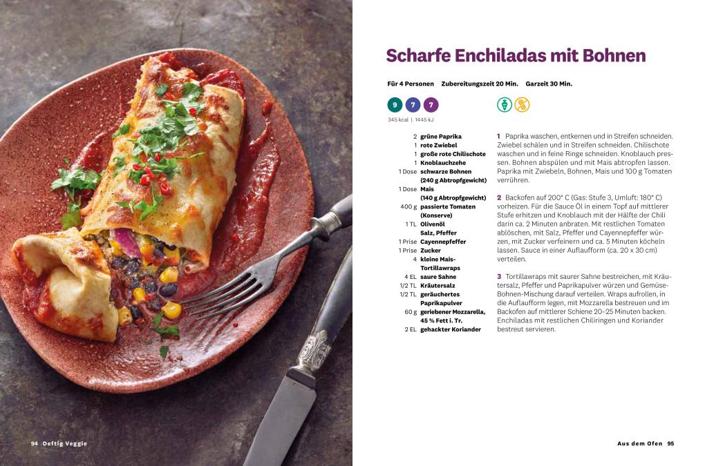 Hier nur einige Beispiele: Eine Mexikanische Eierpfanne ist schnell zubereitet, ganz ohne Fleisch und macht wunderbar satt. Eine köstliche Pasta mit Pak-Choi-Pilz-Rahmsauce oder eine scharfe Kichererbsen-Blumenkohl-Suppe sind nicht nur fleischlos-deftig, sondern bringen Abwechslung auf den Teller. Eine Gemüse-Linsen-Lasagne oder ein Karotten-Rucola-Salat mit Bunter Bete werden unkompliziert im Backofen zubereitet und bieten zu den gewohnten Veggie-Gerichten allesamt eine schmackhafte und deftige Alternative.