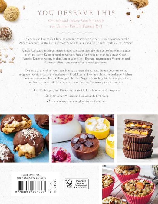 So geht gesundes Snacken: Über 70 gesunde, ausgewogene und leckere Snack-Rezepte von Fitness-Vorbild Pamela Reif! Energie-Kick zwischendurch gefällig? Unterwegs und keine Zeit für eine gesunde Mahlzeit? Abends nochmal richtig Lust auf etwas Süßes? In all diesen Situationen greifen wir zu Snacks, die oft ziemlich ungesund sind. Social-Media-Star Pamela Reif sorgt mit ihrem neuen Clean-Eating-Kochbuch dafür, dass die kleinen Zwischenmahlzeiten nicht zu leeren Kalorienbomben werden. Die einfachen, schnell gemachten und vollwertigen Snacks basieren alle auf natürlichen Lebensmitteln, möglichst wenig industriell verarbeiteten Produkten und können ohne stundenlange Küchenarbeit zubereitet werden. Herzstück des Kochbuchs sind die über 70 Snack-Rezepte, von Pamela Reif entwickelt, zubereitet und fotografiert, aufgeteilt in die Kapitel Energy Balls, Fruchtiges, Riegel, Süßes, Herzhaftes und Muffins, Kekse & Kuchen. Abgerundet wird das Kochbuch mit über 40 Seiten Wissen rund um gesunde Ernährung, bewussten Konsum und einen ausgewogenen Lebensstil. Rezepte, die vegetarisch, vegan, glutenfrei oder ohne Nüsse sind, werden mit Symbolen ausgewiesen. Snack für Snack tut man sich etwas Gutes, denn Pamelas Rezepte versorgen den Körper schnell mit Energie, zusätzlichen Vitaminen und Mineralstoffen - und schmecken einfach großartig!