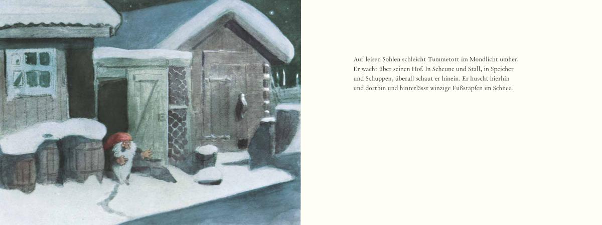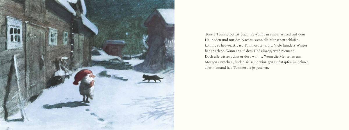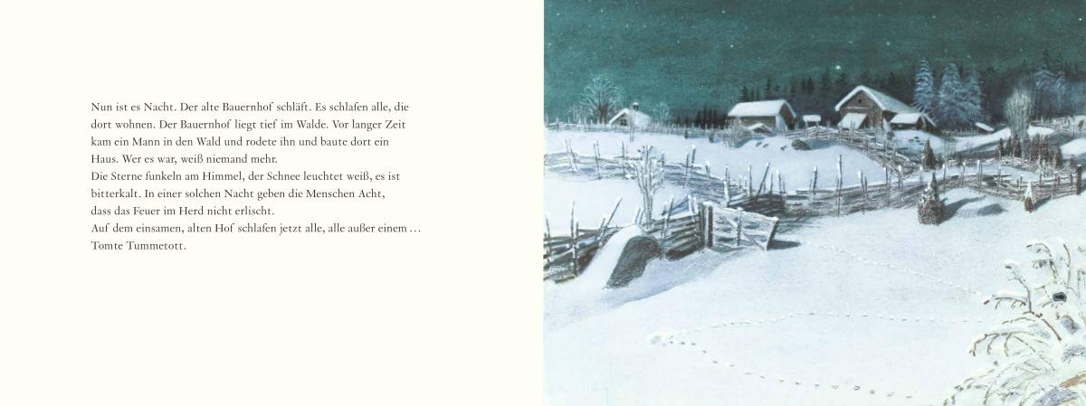 Wenn die Sterne am Himmel funkeln und der Schnee weiß leuchtet, schleicht auf leisen Sohlen Tomte Tummetott, der Wichtel mit der roten Mütze, im Mondlicht umher und hinterlässt winzige Fußstapfen. Er bewacht die schlafenden Menschen und die Tiere auf dem Hof und erzählt ihnen vom Frühling, der bald kommen wird ...