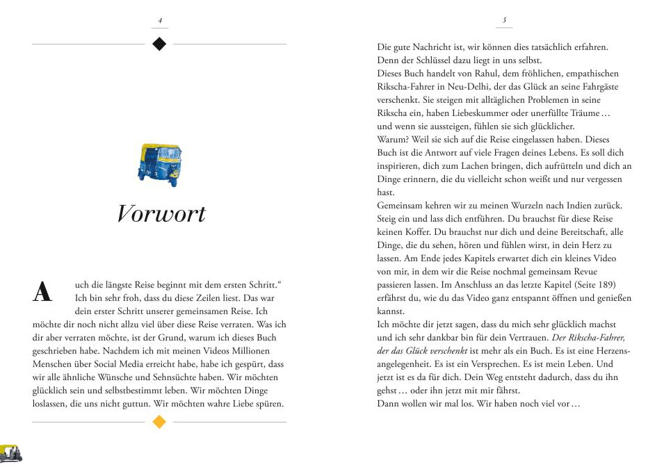 Biyon Kattilathu, Kind indischer Einwanderer, ist DER Motivations-Entertainer im digitalen Raum. Beflügelt von seiner eigenen Geschichte, hat er in kürzester Zeit die Social-Media-Bühne erobert und über seine Kanäle Menschen in Scharen begeistert. Erstmals wendet er sich nun in Buchform an seine Fans: Die Hauptfigur in seinem erzählten Ratgeber ist ein indischer Rikscha-Fahrer. So wie Biyon in seiner Eigenschaft als Speaker und Lebenslehrer, hilft der Rikscha-Fahrer ganz nebenbei auf der Fahrt jedem seiner Gäste bei wichtigen Lebensproblemen. In 12 Kapiteln bzw. Episoden werden die wichtigsten Lebensthemen behandelt, die uns Menschen umtreiben. Es geht um Liebe und Verlust, um Angst und Mut, um Verletzlichkeit und Selbstliebe, um Aufrichtigkeit und das konsequente Verfolgen unserer Lebensziele sowie die Kraft, zu uns zu stehen und Entscheidungen zu treffen, die uns stark machen für die Herausforderungen des Lebens.