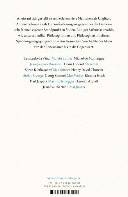 Jeder Mensch ist zunächst einmal ein Einzelner. Das kann zur Belastung werden, vor der ein Leben in Gemeinschaft schützt, das kann aber auch den Ehrgeiz wecken, die eigene Individualität zu kultivieren. Zwischen beiden Polen unserer Existenz hat es immer wieder eindrucksvolle Versuche gegeben, einzeln zu sein. Davon erzählt Rüdiger Safranski in seinem neuen Buch. Er beginnt bei Michel de Montaigne und führt über Rousseau, Diderot, Kierkegaard, Stirner und Thoreau bis zur existentialistischen Philosophie des 20. Jahrhunderts. Dabei nähert er sich aus immer anderen Richtungen der Frage, wie weit wir es ertragen, Einzelne zu sein - eine Frage, die sich ganz überraschend in unser alltägliches Leben gedrängt hat.