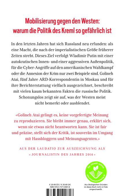 Seit dem "Anschluss" der Krim erfindet sich Russland neu: als eine Großmacht, die chauvinistisch spricht und aggressiv handelt. Das sagt Golineh Atai, die für ihre Berichterstattung aus Moskau vielfach ausgezeichnet worden ist. Sie erklärt die tieferen Gründe für eine Politik, die im Westen vielfach kaum wahrgenommen, in falsche Vergleiche heruntergebrochen oder einfach verdrängt wird. Die Wahrheit ist: Russland sieht sich im Krieg. Und Russlands Aggression existiert darüber hinaus auch in alten und neuen globalen Medien, im Cyberspace, im Wirtschaftsraum. Eine der besten Kennerinnen Russlands erklärt, warum Russland die globale Ordnung offen herausfordert - in einer Zeit, in der die Fortdauer ebendieser Ordnung ungewiß ist.