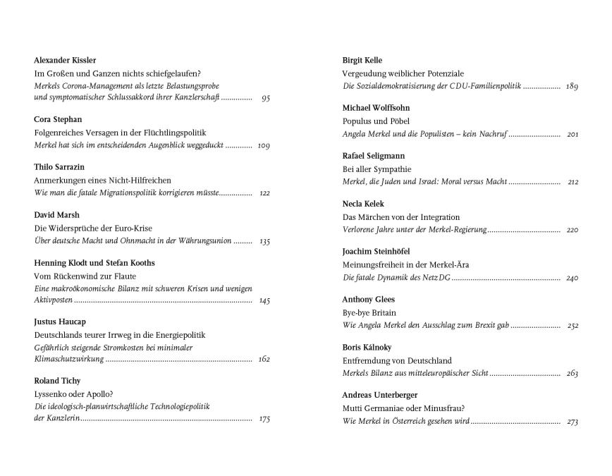 In dieser überarbeiteten und erweiterten Neuausgabe des Bestsellers ziehen 24 Professoren und Publizisten eine Bilanz der Ära Merkel. Der Herausgeber, FAZ-Redakteur Philip Plickert, hat renommierte Autoren versammelt, die das politische Wirken und die Person Merkels analysieren. Mit dabei sind so profilierte Köpfe wie der Kommunikationswissenschaftler Norbert Bolz, die deutsch-türkische Soziologin Necla Kelek, die Publizistin Cora Stephan, die Historiker Dominik Geppert und Michael Wolffsohn, der Bestsellerautor Thilo Sarrazin, der Wirtschaftspublizist Roland Tichy, die Feminismuskritikerin Birgit Kelle, der Jurist Joachim Steinhöfel, Ökonomie-Professoren wie Justus Haucap sowie Politologen und Journalisten aus England, Amerika und Osteuropa.