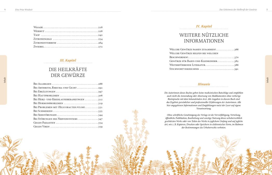 Das zweite Buch der Trilogie "Eine Prise" geht noch einen Schritt weiter. Im Buch werden 20 weitere Gewürze mit ausgeprägten Heilkräften sowie eine sehr umfangreiche Liste von Beschwerden aufgeführt, von denen die meisten Menschen nicht einmal im Traum daran denken, dass sie mit Gewürzen behandelt werden können.