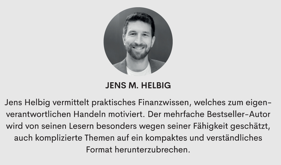 Auf seinem eigenen Weg in die finanzielle Freiheit sammelte Jens Helbig in über 30 Ländern, während seines Studiums der Volkswirtschafts- lehre in Mexiko-Stadt und bei seiner Tätigkeit in einem deutschen Family Office wertvolle Erfahrungen. So verfasste er bereits im Alter von 26 Jahren gemeinsam mit Co-Autor Christopher Klein seine ersten beiden Werke „Tag auf Tag im Hamsterrad“ und „Der Hamster verlässt das Rad“. Letzterer Titel schaffte es 2018 auf Platz 2 im gesamten Kindle-Store. Seine jüngsten Veröffentlichungen „Einmal Dividende bitte!“ und „Mit Blockchain zum Krypto-Investor“ wurden zu Amazon-Bestsellern.