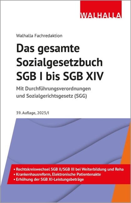 SGB I - Allgemeiner TeilSGB II - Bürgergeld, Grundsicherung für Arbeitsuchende: Bürgergeld-VO, Kommunalträger-ZulassungsVO, MindestanforderungsVO, ErreichbarkeitsVOSGB III - Arbeitsförderung: Erreichbarkeits-Anordnung, VO ehrenamtliche Betätigung von Arbeitslosen, Akkreditierungs- und ZulassungsVOSGB IV - Gemeinsame Vorschriften für die Sozialversicherung: SozialversicherungsentgeltVOSGB V - Gesetzliche Krankenversicherung: PatientenbeteiligungsVOSGB VI - Gesetzliche RentenversicherungSGB VII - Gesetzliche Unfallversicherung: BerufskrankheitenVOSGB VIII - Kinder- und Jugendhilfe: KostenbeitragsVO, Unfallversicherungs-AnzeigeVOSGB IX - Rehabilitation und Teilhabe behinderter Menschen: BudgetVO, FrühförderungsVO, AusgleichsabgabeVO, WerkstättenVOSGB X - Sozialverwaltungsverfahren und SozialdatenschutzSGB XI - Soziale Pflegeversicherung, Bekanntmachung der ab 1.1.2025 geltenden LeistungsbeträgeSGB XII - Sozialhilfe: VO Hilfe zur Überwindung besonderer sozialer Schwierigkeiten, Freigrenzen-VOSGB XIV - Soziale Entschädigung, BerufsschadensausgleichsVO, VO zum Einkommen und Vermögen im SGB XIV, AuslandszuständigkeitsVOSGG - Sozialgerichtsgesetz
