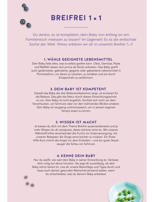 Zu Beginn des Buchs wird genau erklärt, wann der richtige Zeitpunkt für die Beikost gekommen ist. Aber nicht nur das! Du erfährst alles, was zum Thema breifreier Beikost bzw. baby led weaning (BLW) wichtig ist: