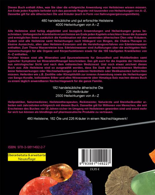 Dieses Buch enthält Alles, was Sie über die sofortige Anwendung von Heilsteinen, ätherischen Ölen und Kräutern (auch in Form von Nahrungsergänzungsmitteln) wissen müssen. Im Grunde genommen ist das Buch so aufgebaut, dass Sie die passenden Heilsteine ohne viel nachzulesen sofort auswählen und anwenden können. Dasselbe gilt für alle Kräuter und ätherischen Öle. Am Ende jeden Kapitels befindet sich das passende Register mit tausenden von Heilwirkungen von A-Z 480 handelsübliche und gut erforschte Heilsteine mit über 4000 Heilwirkungen von A-Z. Farbige Abbildungen aller Steine, Heilwirkungen auf Körper und Seele, geschichtliche Hintergründe und alles Wissenswerte zur inneren und äußeren Anwendung sind so beschrieben, dass Sie ohne großen Aufwand die passenden Heilsteine für Ihre Anliegen finden. Sie schlagen einfach im Krankheitsverzeichnis hinter jedem Kapitel nach. Natürlich können Sie Dank der Krankheitsverzeichnisse Ihre Heilsteine auch mit ätherischen Ölen oder Kräutern Ihrer Wahl kombinieren. Zudem sind alle Heilwirkungen nach Hildegard von Bingen, die Chakra-Lehre inklusive Auraschutz, die Anwendungen von Heilstein-Essenzen und die Herstellungsverfahren von Edelsteinwasser enthalten. Zum Thema Wassersteine finden Sie alles Wissenswerte, um sich in wenigen Minuten Ihr persönliches Heilsteinwasser selbst herstellen zu können. Zudem sind Auflistungen über die wichtigsten Heilsteinmischungen für alle Organe und Körperfunktionen und die 100 häufigsten Krankheitsgebiete von A-Z enthalten. Alle Mineralien und Spurenelemente samt typischer Symptome bei Mineralstoffmangel sind umfangreich beschrieben. Das gilt auch für die Aspekte der Heilsteine aus astrologischer Sicht und nach dem indianischen Medizinrad. Und noch etwas zeichnet dieses Buch aus: Alle Heilsteine sind so ausgewählt worden, dass Sie Dank der beschriebenen Methoden keine Nebenwirkungen oder Wechselwirkungen mit anderen Heilmitteln oder Medikamenten befürchten müssen. Heilerden wie z.B. Zeolithe, Klinoptilolith oder Shungit zur inneren Anwendung sowie die Heilwirkungen von Sango-Koralle, kolloidalem Silber und alles Wissenswerte über Hima-laya-Salz machen dieses Buch zu einem täglich anwendbaren Nachschlagewerk für die ganze Familie. 182 handelsübliche ätherische Öle und 226 Kräuter mit über 2500 Heilwirkungen von A-Z sind detailliert beschrieben. Zudem wurden auch Kräuter berücksichtigt, die Sie eventuell z.B. in Form von Gewürzen oder Tee in der Küche haben oder die als Nahrungsergänzungsmittel genutzt werden können. Heilpraktiker, Naturmediziner, Heilsteintherapeuten, Reikimeister, Naturärzte und Steinheilkundler arbeiten seit Jahrzehnten erfolgreich mit diesem Buch. Dasselbe gilt für Millionen von Menschen, die Dank dieses Buches mehr für sich tun können als blindlings auf pharmazeutische Produkte zu vertrauen.