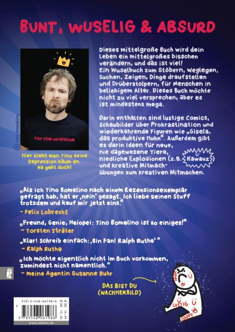 Bunt, wuselig & absurd Dieses mittelgroße Buch wird dein Leben ein mittelgroßes bisschen verändern, und das ist viel! Ein Wuselbuch zum Stöbern, Weglegen, Suchen, Zeigen, Dinge draufstellen und Drüberstolpern, für Menschen in beliebigem Alter. Dieses Buch möchte nicht viel versprechen, aber es ist mindestens mega. Darin enthalten sind lustige Comics, Schaubilder über Prokrastination und wiederkehrende Figuren wie "Gisela, das produktive Huhn". Außerdem gibt es darin Ideen für neue, nie dagewesene Tiere, niedliche Explosionen (z.B. Kawauz) und kreative Mitmachübungen zum kreativen Mitmachen. "Als ich Tino Bomelino nach einem Rezensionsexemplar gefragt hab, hat er 'nein' gesagt. Ich liebe seinen Stuff trotzdem und kauf mir jetzt eins." Felix Lobrecht "Freund, Genie, Heiopei: Tino Bomelino ist so einiges!" Torsten Sträter "Klar! Schreib einfach: 'Bin Fan! Ralph Ruthe'" Ralph Ruthe "Ich möchte eigentlich nicht im Buch vorkommen, zumindest nicht namentlich." meine Agentin Susanne Buhr
