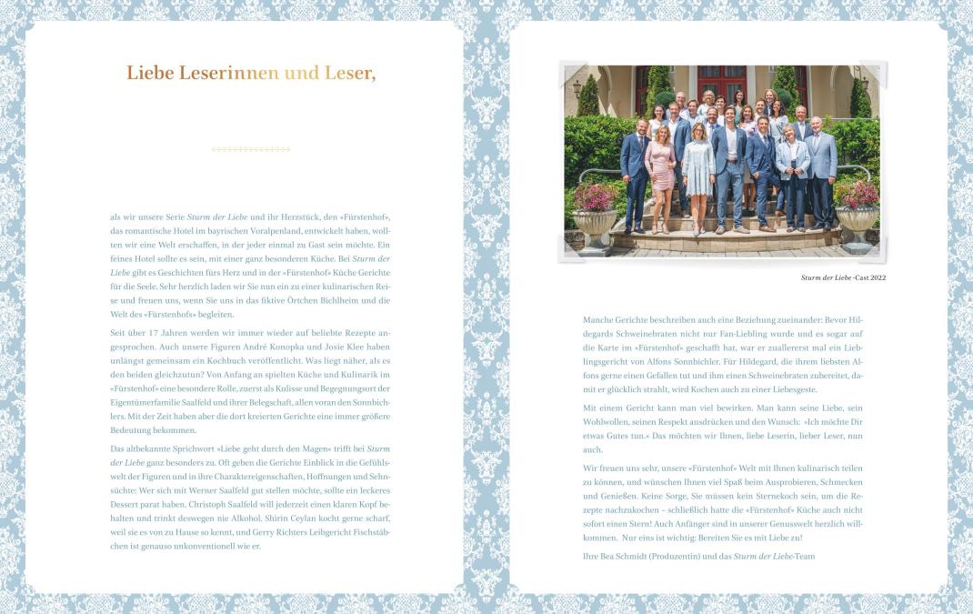Holen Sie sich Europas erfolgreichste Telenovela und damit echtes Fürstenhof-Feeling in Ihre Küche! Dieses Buch trägt die bekanntesten Rezepte des malerischen 5-Sterne-Hotels am Fuße der bayerischen Alpen zusammen: von Hildegards traditionellem Schweinebraten über Andrés Parfait „Charlotte“, Cocktails aus der Piano-Bar, Josies veganem Schnitzel bis hin zu Lauras Geheimrezept für den „Süßen Kuss“. Das besondere Extra: Neben exklusiven Einblicken finden sich im Kochbuch auch Lieblingsgerichte der Charaktere. Genießen wie am Fürstenhof – mit diesem Buch steht dem echten "Sturm"-Menü nichts mehr im Weg: ein Muss für alle Serienfans!