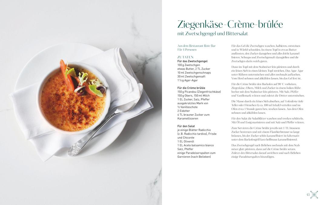 Ziegenkäse Crème brûlée mit Zwetschge und Bittersalaten und