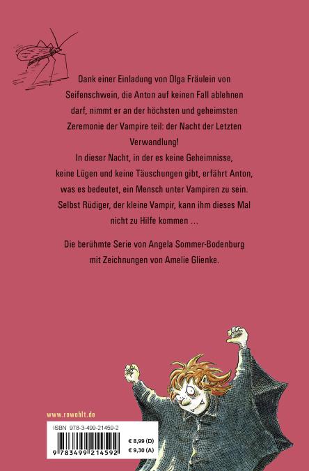 Dank einer Einladung von Olga Fräulein von Seifenschwein, die Anton auf keinen Fall ablehnen darf, nimmt er an der höchsten und geheimsten Zeremonie der Vampire teil: der Nacht der Letzten Verwandlung! In dieser Nacht, in der es keine Geheimnisse, keine Lügen und keine Täuschungen gibt, erfährt Anton, was es bedeutet, ein Mensch unter Vampiren zu sein. Selbst Rüdiger, der kleine Vampir, kann ihm dieses Mal nicht zu Hilfe kommen ...