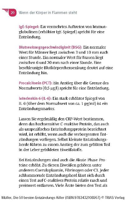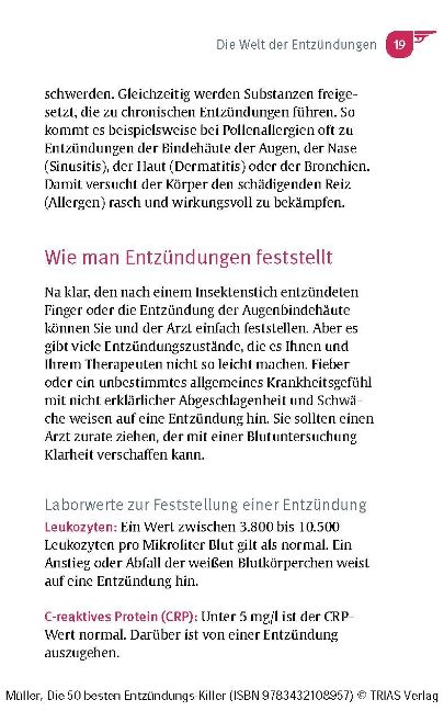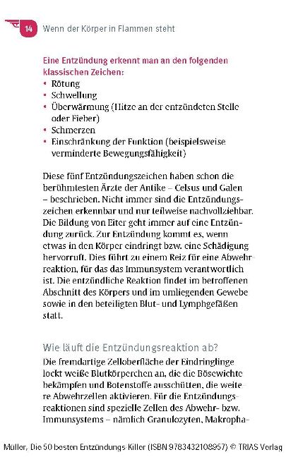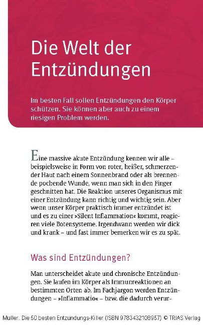 Versteckt, aber brandgefährlich... Arthrose, Demenz, Krebs oder Diabetes mellitus - viele Erkrankungen haben ihre Ursache auch in stillen Entzündungen, die den Körper von innen heraus schwächen. Das Schlimme! Sie spüren diese Entzündungen nicht - mit folgendem Handwerkszeug können Sie diese jetzt aber erfolgreich bekämpfen: Vitamin D, Zink und Selen - was Mikronährstoffe für Ihr Immunsystem tun können Wie Sie Ihren Darm mit Probiotika, Haferflocken & Co. stärken und die Abwehr unterstützen Kurkuma, Wildlachs, Avocado und viele mehr - welche Lebensmittel wahre Entzündungskiller sind - inklusive gesunder Rezepte Abnehmen, Schlaf und Entspannung - finden Sie zu einem entzündungshemmenden Lebensstil.