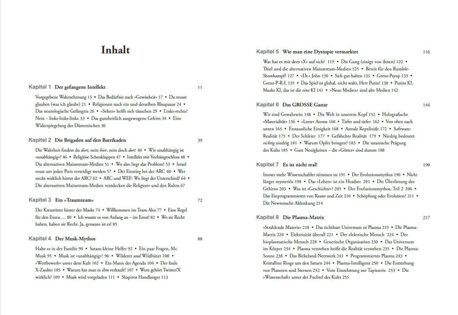 KAPITEL 1: DER GEFANGENE INTELLEKT Vorgegebene Wahrnehmung ¿ Das Bedürfnis nach 'Gewissheit' ¿ Du musst glauben [was ich glaube] ¿ Religionen nach ein und derselben Blaupause ¿ Das neurologische Gefängnis ¿ 'Sehen' ist sich täuschen ¿ Links-rechts? Nein - links-links-links ¿ Das ganzheitlich ausgewogene Gehirn ¿ Eine Widerspiegelung des Dämonischen KAPITEL 2: DIE BRIGADEN AUF DEN BARRIKADEN Die Wahrheit findest du dort, nein hier, nein doch dort ¿ Wie unabhängig ist eigentlich 'unabhängig'? ¿ Religiöse Scheuklappen ¿ Intellekt mit Vorhängeschloss ¿ Die alternativen Mainstream-Medien ¿ Wo also liegt das Problem? ¿ Israel muss um jeden Preis verteidigt werden Der Einstieg bei der ARC ¿ Wer steckt wirklich hinter der ARC? ¿ ARC und WEF: Wo liegt der Unterschied? ¿ Die alternativen Mainstream-Medien 'entdecken die Religion' und den Ruhm KAPITEL 3: 'EIN TRAUMTEAM' Der Kreuzritter hinter der Maske ¿ Willkommen im Team Alex ¿ Eine Regel für den einen ... ¿ Ich wusste es von Anfang an - im Ernst! ¿ Wo sie Recht haben, haben sie Recht. Ja, genauso ist es! KAPITEL 4: DER MUSK-MYTHOS Halte es in der Familie ¿ Satans kleine Helfer ¿ Ein paar Fragen, Mr. Musk ¿ Musk ist 'unabhängig'? ¿ Wilderer und Wildhüter ¿ 'Wettbewerb' unter dem Kult ¿ Ein Mann der Agenda ¿ Der faule X-Zauber ¿ Warum hat man es ihm verkauft? ¿ Wem gehört Twitter/X wirklich? ¿ Musk wird vorgeladen ¿ Shapiros Handlanger KAPITEL 5: DYSTOPIA VERKAUFEN Was hat es mit dem 'X' auf sich? ¿ Die Gang (einige von ihnen) ¿ Thiel und die Alternativen Mainstream-Medien ¿ Bereit für den Rumble-Showkampf? ¿ 'Dr.' John ¿ Sich gut halten ¿ Grenz-Psyop ¿ Grenz-P-R-L ¿ Das Spiel ist global, nicht wahr, Herr Putin? ¿ Putins KI, Musks KI, das ist die eine KI ¿ 'Neue Medien' sind alte Medien KAPITEL 6: DAS GROSSE GANZE Wir sind Gewahrsein ¿ Die Welt in unserem Kopf ¿ Holografische 'Materialität' ¿ 'Leere' Atome ¿ Tiefer und tiefer ¿ Von oben nach unten ¿ Erstaunliche Einigkeit ¿ Astrale Reptiloide ¿ Software-Realität ¿ Der Schleier ¿ Gefälschte Realität ¿ Niedrig bedeutet richtig niedrig ¿ Warum Opfer bringen? ¿ Die satanische Prägung des Kults ¿ Gute Neuigkeiten - die 'Götter' sind dumm KAPITEL 7: ES IST NICHT REAL! Immer mehr Wissenschaftler stimmen zu ¿ Der Evolutionsmythos ¿ Nicht länger mysteriös ¿ Das 'Leben' ist ein Headset ¿ Die Überlistung des Gehirns ¿ Was ist 'Geschichte'? ¿ Der Evolutionsmythos [2] ¿ Das Einprogrammieren von Raum und Zeit ¿ Schöpfung oder Evolution? ¿ Die Newtonsche Ablenkung KAPITEL 8: DIE PLASMA-MATRIX 'Strahlende Materie' ¿ Die Plasma-Matrix ¿ Elektrizität überall ¿ Der elektrische Mensch ¿ Der bioplasmatische Mensch ¿ Genetische Organisation ¿ Das Universum im Körper ¿ Plasma verstehen bedeutet, die Realität verstehen ¿ Die Plasmasonne ¿ Das Birkeland-Netzwerk ¿ Programmiertes Plasma ¿ Kristalline Ringe um den Saturn ¿ Plasma-Intelligenz ¿ Die Entstehung von Planeten und Sternen ¿ Vom Einzelstrang zur Tapisserie ¿ Die 'Wissenschaft' unter der Fuchtel des Kults KAPITEL 9: BABY, KOMM ZURÜCK! Überzeugende Fälle ¿ Akribische Forschung ¿ Es stimmt ... ABER ... ¿ Tut mir leid, da zieh ich nicht mit ¿ Warum? Warum? Warum nur? ¿ Wir drehen am Rad ¿ Die verborgene Wahrheit hinter der Reinkarnation ¿ Geschichten von Nahtoderfahrungen ¿ Der Lebensrückblick ¿ Ehrfurcht vor den 'Ältesten' ¿ Astrale Plasma-KI ¿ Die plasmabasierte 'Akasha-Chronik' ¿ Echtes Cloud-Computing ¿ Zwei Wolken mit vielen Komponenten ¿ Der Schwindel mit dem Karma KAPITEL 10: ES ERGIBT KEINEN SINN Ein paar Fragen ¿ Ihr Kinderlein kommet - wir brauchen Loosh ¿ Hierarchie, wohin man schaut ¿ Unterschreiben Sie hier ¿ Jenseits des Regenbogen ¿ Fragmentierung der Seele ¿ KI-gestützte Körperwahl ¿ Wenn es ein Teil von dir bereits weiß KAPITEL 11: 'WIR HABEN DIE SEELENFALLE GESEHEN' Wer trifft die Entscheidungen? ¿ Sinkflug in die Materie ¿ 'Ahnungslose Babys' ¿ Der 'Katalog' wird gesichtet ¿ Astralreiseführer ¿ 'Ich glaube, ich habe die Seelenfalle gesehen' ¿ 'Wir haben die Seelenfalle gesehen' ¿ Unterschiedliche Quellen, identische Schlussfolgerungen ¿ Die 'Jenseits'-Sequenz ¿ Die Falle umgehen ¿ Simulierte 'Barriere' ¿ Die Leere ¿ 'Ich bin sieben Mal gestorben' ¿ Der 'Metallgott' ¿ Simuliertes Sonnensystem ¿ 'Die Tiefe' ¿ Der große Umbruch - die große Rückkehr ¿ 'Spiritueller' Magnetismus KAPITEL 12: IN YALDABAOTHS BEWUSSTSEIN 'Gott' spielen ¿ Was war das 'Goldene Zeitalter' wirklich? ¿ Im Inneren des 'Wales' ¿ Matrix = Gedächtnis und Glaube ¿ Jaldabaoths Assimilation ¿ Unausweichlich = 'sicheres Ereignis; unvermeidlich' ¿ Affenschande ¿ Science-fiction? Nein - Science Fact ¿ Assimilation der 'Nachrichten' ¿ Der neue 'Mensch' ¿ Cyber-Mensch KAPITEL 13: DOCH NICHT SO VERRÜCKT? Die wahre Agenda ¿ Simulation - die nächste Grenzlinie ¿ Zugriff über die 'Covid-Impfstoffe' ¿ Graphenintelligenz ¿ Die Graphen-Schnittstelle ¿ Graphenhimmel ' ¿ Außerirdische und Black Goo ¿ Optimale Loosh-Versorgung ¿ Der 'Covid'-Coup ¿ Verschmutzung des Feldes ¿ Neuverschaltung der Realität ¿ Krankheit X KAPITEL 14: SO WIRD'S GEMACHT Chaostheorie ¿ 'Wir werden alle sterben!' ¿ UN-Problem und -Lösung ¿ Kein Autofahren mehr ¿ Keine Freiheit mehr ¿ Künstlich erzeugter Hunger ¿ Schlachtfeld 'Natur' ¿ 'Du wirst nichts besitzen' ¿ Programmierbares 'Geld' ¿ Offene Türen ¿ Ablenkungsmanöver KAPITEL 15: DER WITZ Wisse, dass du nichts weißt ¿ Selbstverständlichkeiten ¿ Selbstverständlichkeiten = Orthodoxie ¿ Islam-Selbstverständlichkeit ¿ Meine 'neue' Religion ¿ Alle Mann zum Ausgang! ¿ Dramasüchtig ¿ Die Social-Media-Falle ¿ Opfermentalität = Ich bin machtlos ¿ 'Ich fühle mich beleidigt!' Dann entscheide dich doch einfach, es nicht zu sein ¿ Das soll mich beleidigen? ¿ Ariel wäscht weißer! Haha ... ¿ Es ist egal KAPITEL 16: DAS HERZ ALLER DINGE Die Neuverkabelung ¿ Die Macht des Her