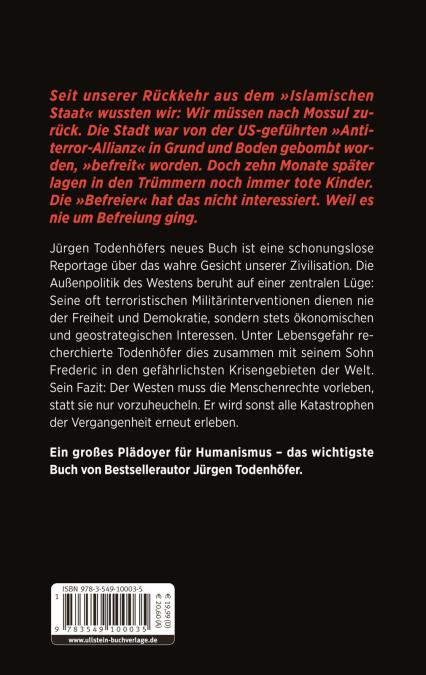 Seit unserer Rückkehr aus dem »Islamischen Staat« wussten wir: Wir müssen nach Mossul zurück. Die Stadt war von der US-geführten »Antiterror-Allianz« in Grund und Boden gebombt worden, »befreit« worden. Doch zehn Monate später lagen in den Trümmern noch immer tote Kinder. Die »Befreier« hat das nicht interessiert. Weil es nie um Befreiung ging. Jürgen Todenhöfers neues Buch ist eine schonungslose Reportage über das wahre Gesicht unserer Zivilisation. Die Außenpolitik des Westens beruht auf einer zentralen Lüge: Seine oft terroristischen Militärinterventionen dienen nie der Freiheit und Demokratie, sondern stets ökonomischen und geostrategischen Interessen. Unter Lebensgefahr recherchierte Todenhöfer dies zusammen mit seinem Sohn Frederic in den gefährlichsten Krisengebieten der Welt. Sein Fazit: Der Westen muss die Menschenrechte vorleben, statt sie nur vorzuheucheln. Er wird sonst alle Katastrophen der Vergangenheit erneut erleben. Ein großes Plädoyer für Humanismus - das wichtigste Buch von Bestsellerautor Jürgen Todenhöfer.
