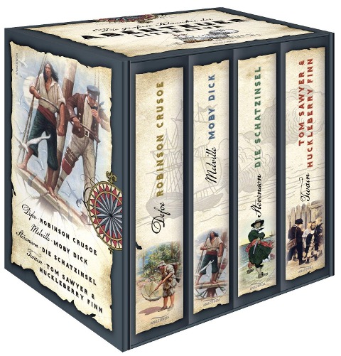 Der geschmackvoll gestaltete Schmuckschuber mit den spannenden Abenteuern Robinson Crusoe, Moby Dick, Die Schatzinsel, Tom Sawyer & Hucklebery Finn ist das ideale Geschenk für Leser klassischer Abenteuer-Romane.