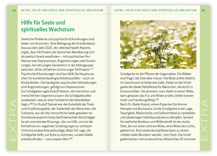 Entdecken Sie die faszinierende Welt der Schafgarbe! Dieses unscheinbare Wunder der Natur überrascht mit einem erstaunlich breiten Wirkspektrum und gilt als eine der besten Frauen-Heilpflanzen. Dank ihrer Inhaltsstoffe - darunter wertvolle ätherische Öle, Bitterstoffe und Flavonoide - wirkt Achillea millefolium u.a. antibakteriell und antiviral, blutstillend, menstruationsregulierend, entzündungs- und krebshemmend, entgiftend, krampflösend, schmerzlindernd, durchblutungs- und verdauungsfördernd. Doch das ist noch lange nicht alles: Ihre ausgleichende, harmonisierende Natur macht die Schafgarbe zum Allheilmittel - so hilft sie sowohl bei Durchfall als auch bei Verstopfung und bei schwacher Monatsblutung ebenso wie bei zu starker.