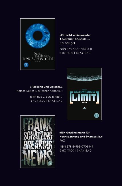 Frank Schätzing, geboren 1957 in Köln, veröffentlichte 1995 den historischen Roman »Tod und Teufel«, der zunächst regional, später bundesweit zum Bestseller avancierte. Nach zwei weiteren Romanen, einem Band mit Erzählungen sowie dem Thriller »Lautlos« erschien im Frühjahr 2004 »Der Schwarm«, der seit Erscheinen eine Gesamtauflage von 4,5 Millionen Exemplaren erreicht hat und weltweit in 27 Sprachen übersetzt wurde. Es folgten die Bestseller »Limit« (2009), »Breaking News« (2014) und »Die Tyrannei des Schmetterlings« (2018). Auch als Sachbuchautor hat sich Schätzing einen Namen gemacht. 2006 zeichnete Bild der Wissenschaft seine Evolutionsgeschichte »Nachrichten aus einem unbekannten Universum« als bestes Wissenschaftsbuch aus. 2021 gelang ihm mit »Was, wenn wir einfach die Welt retten?« erneut der Sprung in die Sachbuch-Bestsellerliste.Frank Schätzing lebt und arbeitet in Köln.Auszeichnungen2002 KölnLiteraturPreis2004 Corine in der Sparte Belletristik2005 Kurd-Laßwitz-Preis für Der Schwarm als bester Science-Fiction-Roman des JahresDeutscher Science Fiction Preis für Der SchwarmGoldene Feder für Der SchwarmDeutscher Krimi Preis für Der Schwarm2006 Dr. Kurt Neven DuMont Medaille der Westdeutschen Akademie für Kommunikation2007 »Stein im Brett« Preis des Berufsverbandes Deutscher Geowissenschaftler e.V. (BDG)2007 Premio Bancarella2009 Elisabeth-Mann-Borgese-Meerespreis2011 Deutscher Meerespreis2021 Bayerischer Buchpreis: Ehrenpreis des Bayerischen Ministerpräsidenten