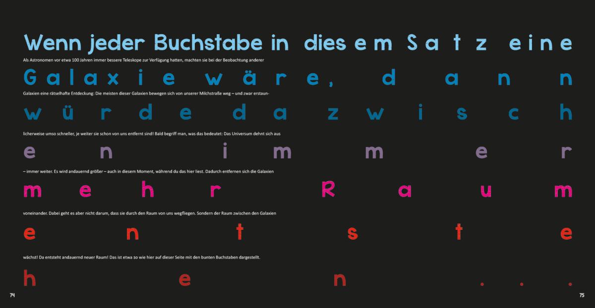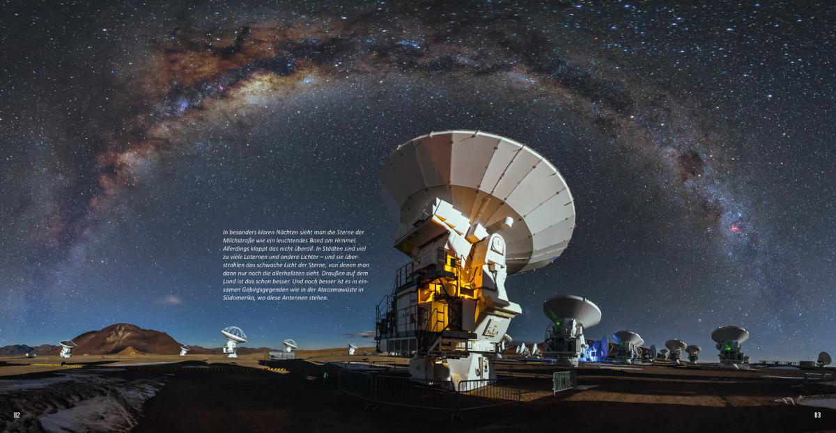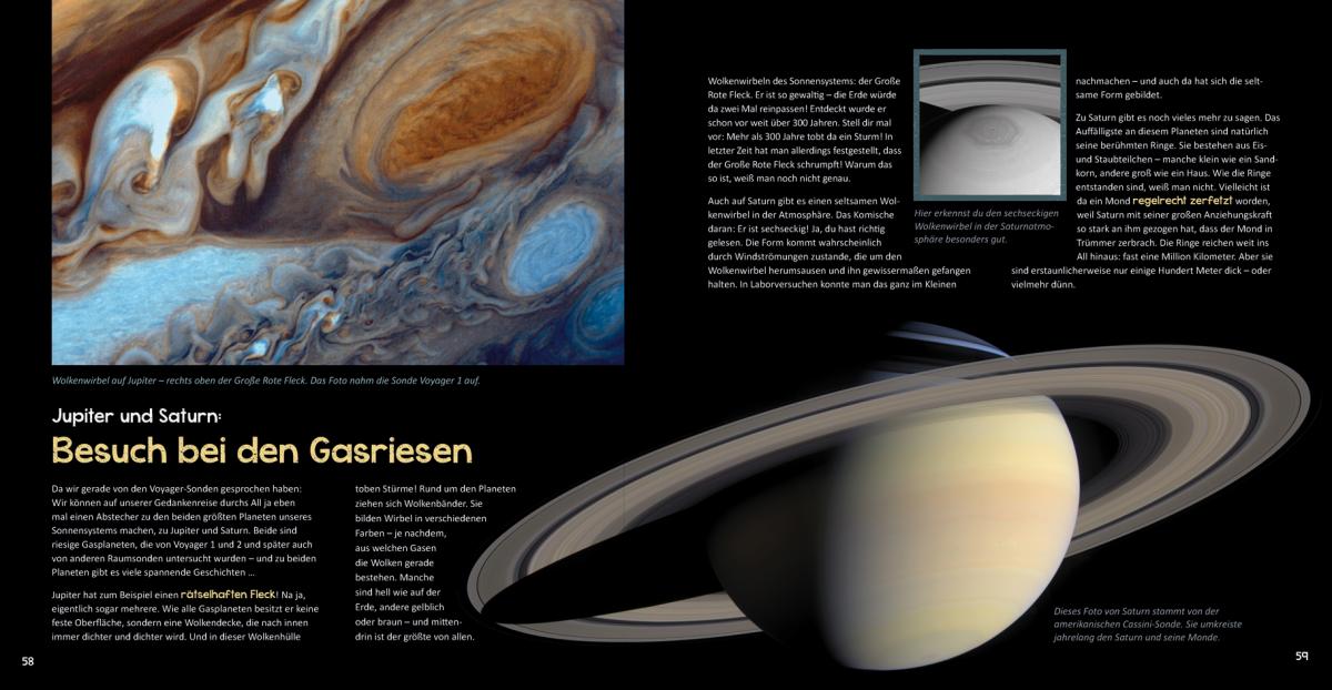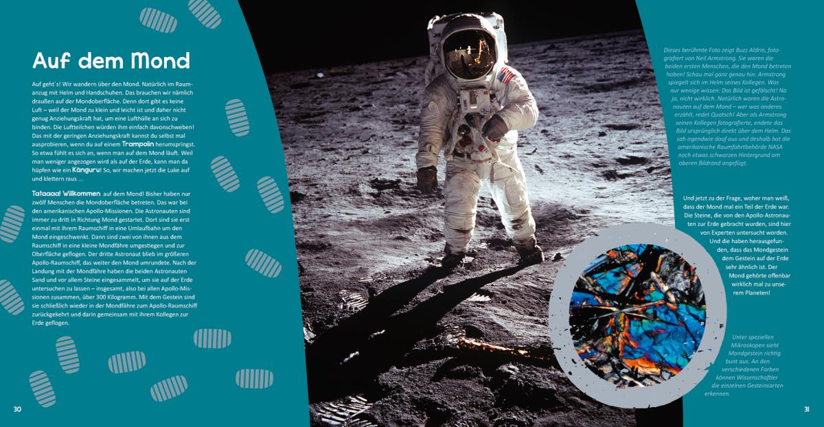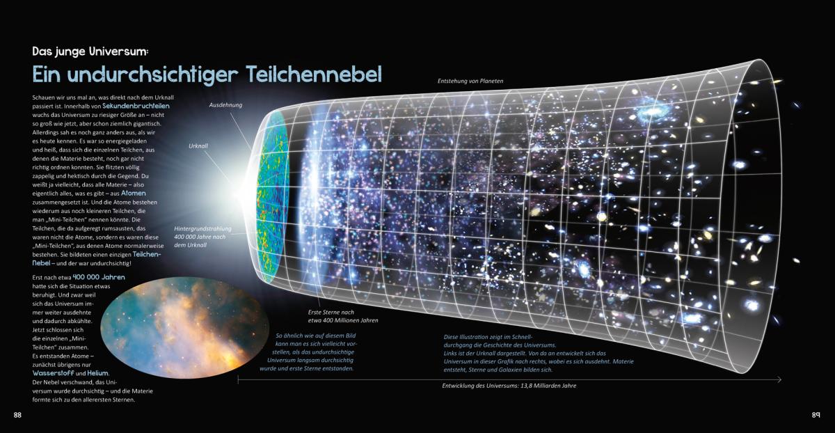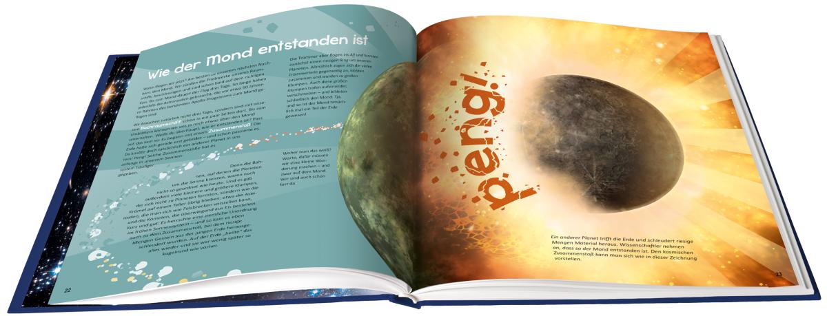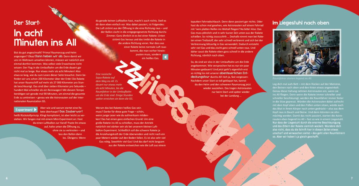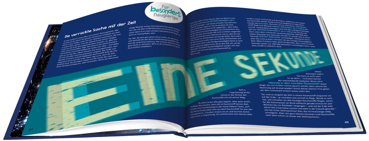 Einfach nur lesen war gestern - dieses Buch entführt die Kinder auf eine unvergessliche Reise ins Weltall! Nach dem Raketenstart machen die Weltraumforscher Halt auf der ISS, experimentieren mit der Schwerelosigkeit, sind auf dem Mond zu Gast und bestaunen Planeten und Sterne, Kometen und Phänomene. Außerdem drehen die Reisenden eine Runde in die Vergangenheit: Zurück bis zum Urknall, mit dem das Universum seinen Anfang nahm. Spannende Sachtexte rund um den Weltraum und aufwändig gestaltete Buchseiten zeigen die Einzigartigkeit und Schönheit unseres Universums. Experimentier-Ideen für Neugierige helfen, auch komplizierte Sachverhalte zu verstehen. Der Countdown läuft - das Raumschiff wartet schon!