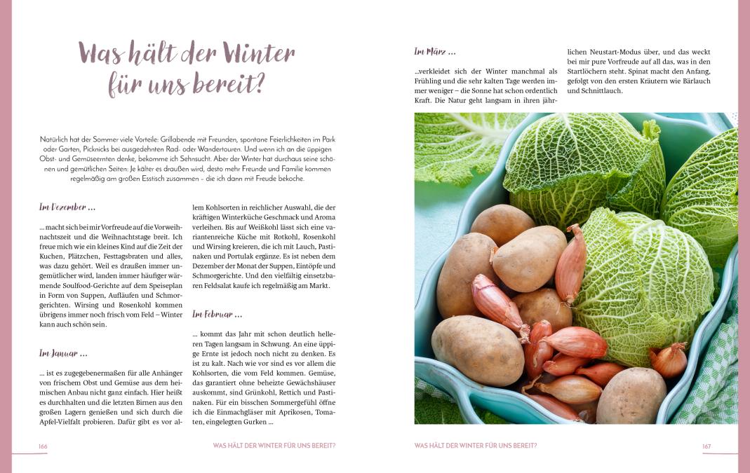 Der umfangreiche Saisonkalender zum Herausnehmen zeigt dir, zu welcher Jahreszeit welches Gemüse oder Obst und welche Salate oder Kräuter frisch aus heimischem Anbau oder als Lagerware erhältlich sind. Dadurch findest du im Kochalltag, egal ob im Frühling, Sommer, Herbst oder Winter, eine passende Rezeptidee, die du ohne viel Aufwand umsetzen kannst.