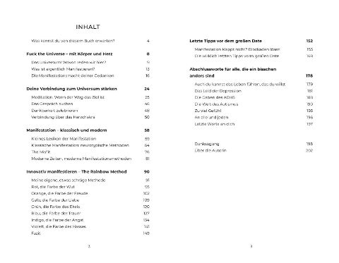 Hinweis zur OptimierungImpressumWichtiger HinweisWas kannst du von diesem Buch erwarten?Fuck the Universe - mit Körper und HerzDeine Verbindung zum Universum stärkenManifestation - klassisch und modernInnovativ manifestieren - The Rainbow MethodLetzte Tipps vor dem großen DateAbschlussworte für alle, die ein bisschen anders sindDanksagungÜber die Autorin