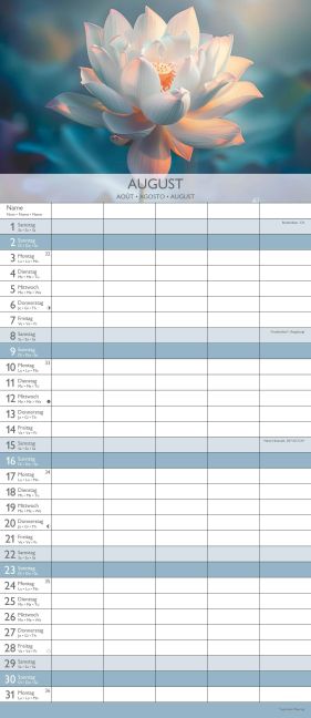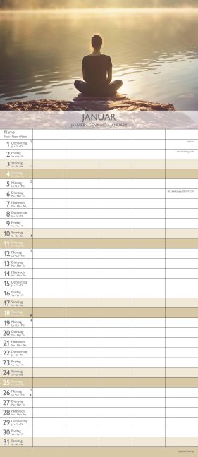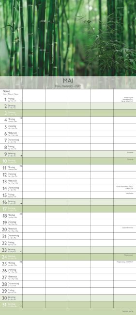 - 4-sprachiges Kalendarium (DE/FR/IT/GB) mit Feiertagen (DE/AT/CH)