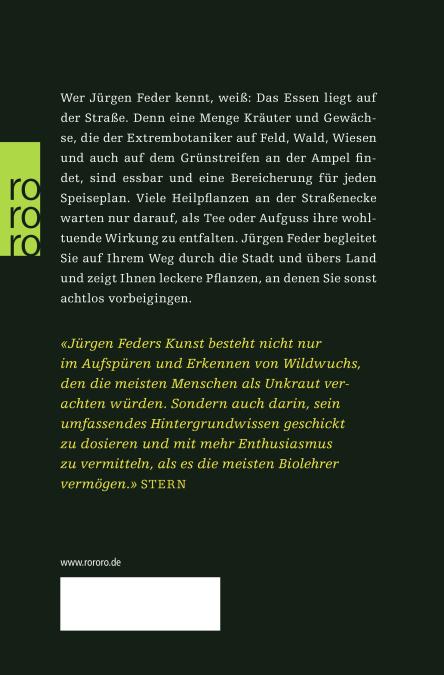 Wer Jürgen Feder kennt, weiß: Das Essen liegt auf der Straße. Denn eine Menge Kräuter und Gewächse, die der Extrembotaniker auf Feld, Wald, Wiesen und auch auf dem Grünstreifen an der Ampel findet, sind essbar und eine Bereicherung für jeden Speiseplan. Viele Heilpflanzen an der Straßenecke warten nur darauf, als Tee oder Aufguss ihre wohltuende Wirkung zu entfalten. Jürgen Feder begleitet Sie auf Ihrem Weg durch die Stadt und übers Land und zeigt Ihnen leckere Pflanzen, an denen Sie sonst achtlos vorbeigingen.