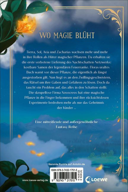 Wo Magie blühtTierra, Sol, Avia und Zacharias wachsen mehr und mehr in ihre Rollen als Hüter magischer Pflanzen. Da erhalten sie die erste verbotene Lieferung des Nachtschatten-Netzwerks: kostbare Samen der legendären Feuerranke. Floras uraltes Buch warnt vor dieser Pflanze, die eigentlich als längst ausgestorben gilt. Nun liegt es an den Zwillingsgeschwistern, das Rätsel um ihre Gaben und Gefahren zu lösen. Doch da taucht ein Problem auf, das alles in den Schatten stellt: Die skrupellose Firma Novocreos hat eine magische Pflanze in die Finger bekommen und ihre rücksichtslosen Experimente bedrohen mehr als nur das Geheimnis der Kinder ...Eine mitreißende und außergewöhnliche Fantasy-ReiheMächtige Geheimnisse, magische Entdeckungen und vier Kinder, die alles entscheiden - willkommen in der Welt der Pflanzen! Eine nostalgische und spannende Fantasy-Reihe für Jungs und Mädchen ab 9 Jahren mit All-Age-Charakter.