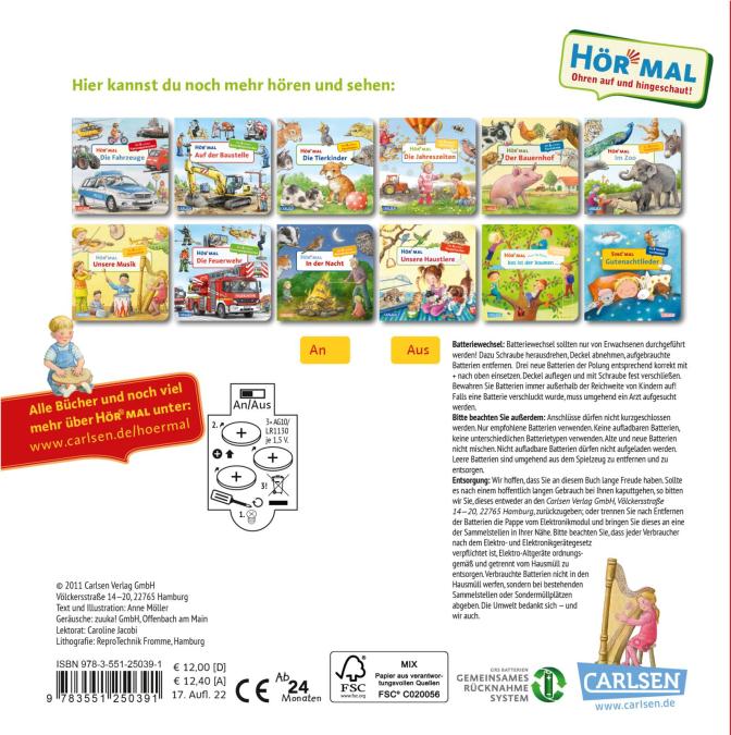 Typisch Hör mal: Jedes Buch enthält 6 leicht auslösbare Sounds mit einer Gesamtspielzeit von 60 Sekunden. Durch Druck auf die farbig markierten Punkte auf jeder Doppelseite werden die Geräusche aktiviert und deaktiviert. Kinder ab 2 Jahren können die Bücher problemlos alleine bedienen, bei jüngeren Kindern sollten die Eltern die Soundbuttons drücken, da die Feinmotorik und Kraft der kleinen Finger noch nicht ausreicht. Alle Titel der Reihe unterliegen strengen Sicherheitsanforderungen und Qualitätskontrollen. Jeder Soundknopf wird vor der Auslieferung auf seine Funktionsfähigkeit geprüft. Die Lautstärke der Sounds entspricht den Vorgaben der europäischen Spielzeugrichtlinie. Ausgeliefert werden die Bücher mit 3 handelsüblichen Knopfzell-Batterien LR 1130 mit je 1,5 V. Die Batterien lassen sich problemlos auswechseln. Dies ist zum Beispiel der Fall, wenn die Sounds nicht mehr die volle Spielzeit haben oder sich nur noch schwer auslösen lassen.