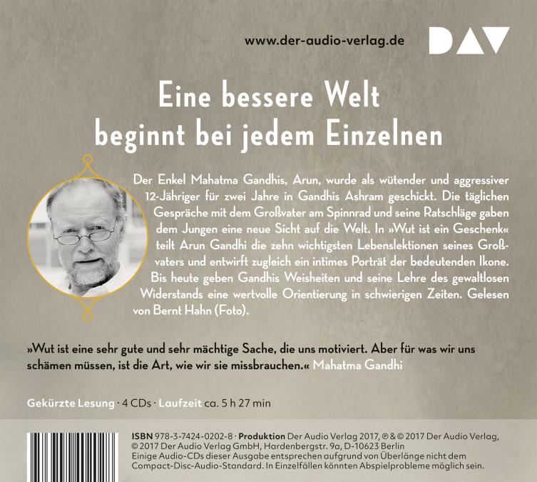 Mahatma Gandhi, einer der einflussreichsten Philosophen und Friedensaktivisten des 20. Jahrhunderts, hat mit seiner Lehre des gewaltlosen Widerstands die Welt verändert. Sein Enkel Arun wurde als wütender und aggressiver 12-Jähriger für zwei Jahre in Gandhis Ashram geschickt. Die täglichen Gespräche mit dem Großvater am Spinnrad und seine Ratschläge gaben dem Jungen eine neue Sicht auf die Welt. In »Wut ist ein Geschenk« teilt Arun Gandhi die zehn wichtigsten Lebenslektionen seines Großvaters und entwirft zugleich ein intimes Porträt der bedeutenden Ikone. Bis heute geben Gandhis Weisheiten eine wertvolle Orientierung in schwierigen Zeiten.