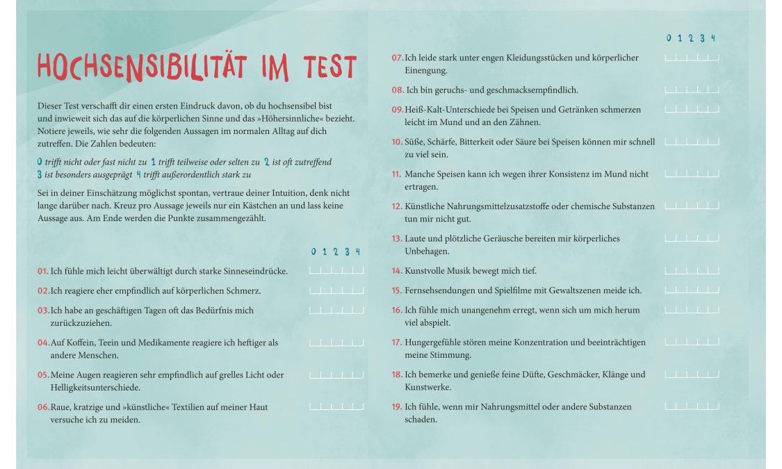 Rund 10% aller Menschen hochsensibel: Sie nehmen aufgrund einer physiologischen Disposition mit ihren fünf Sinnen die unterschiedlichsten Reize wie Geräusche oder Gerüche und Emotionen anderer viel stärker wahr und leiden deshalb oft an der Reizüberflutung des hektischen Alltags. Wenn es aber gelingt, diese intensiven Wahrnehmungen gesund und förderlich in den Alltag zu integrieren, zeigt sich, dass Hochsensibilität eine besondere Gabe ist: hochsensible Menschen können mehr Informationen aufnehmen und haben ein besonderes Gespür für andere Menschen. Anne Heintze, Coach für Hochbegabte und Hochsensible zeigt, wie Hochsensible mit alltagstauglichen Methoden sich selbst und die eigene Feinfühligkeit annehmen und sich vor der Reizüberflutung besser schützen können. Mit vielen Übungen und einem ausführlichen Selbsttest!