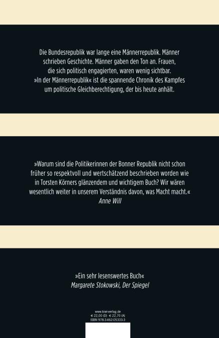 Erst ein Sitzstreik von CDU-Frauen vor dem Kabinettsaal hatte Kanzler Konrad Adenauer 1961 gezwungen, Elisabeth Schwarzhaupt als erste Ministerin in sein viertes Kabinett aufzunehmen. Was ihn nicht daran hinderte, die Regierungsmitglieder weiterhin mit »Guten Morgen, meine Herren« zu begrüßen. Als in den Achtzigerjahren mit dem Einzug der Grünen in den deutschen Bundestag der Feminismus auf die politische Tagesordnung trat, war das Hohngelächter groß. Und auch Angela Merkel schlug in ihren Anfangsjahren noch jede Menge männlicher Ignoranz entgegen. Dennoch gab es von Anfang an in allen Parteien großartige Frauen, die sich politisch engagierten. Von ihnen und ihren Kämpfen um Macht und Gleichberechtigung erzählt Torsten Körner in dieser brillant geschriebenen weiblichen Geschichte der Bonner Republik.