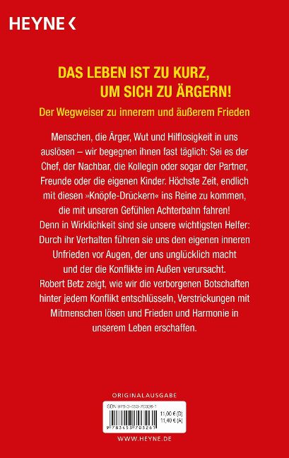 Menschen, die Ärger, Wut und Hilflosigkeit in uns auslösen - wir begegnen ihnen fast täglich: Sei es der Chef, der Nachbar, die Kollegin oder sogar der Partner, Freunde oder die eigenen Kinder. Höchste Zeit, endlich mit diesen »Knöpfedrückern« ins Reine zu kommen, die mit unseren Gefühlen Achterbahn fahren! Denn eigentlich sind sie unsere wichtigsten Helfer: Durch ihr Verhalten führen sie uns den eigenen inneren Unfrieden vor Augen, der uns unglücklich macht und der die Konflikte im Außen verursacht. Robert Betz zeigt, wie wir die verborgenen Botschaften hinter jedem Konflikt entschlüsseln, negative Gefühle auflösen und endlich Frieden schließen können - mit uns selbst und den Menschen um uns.