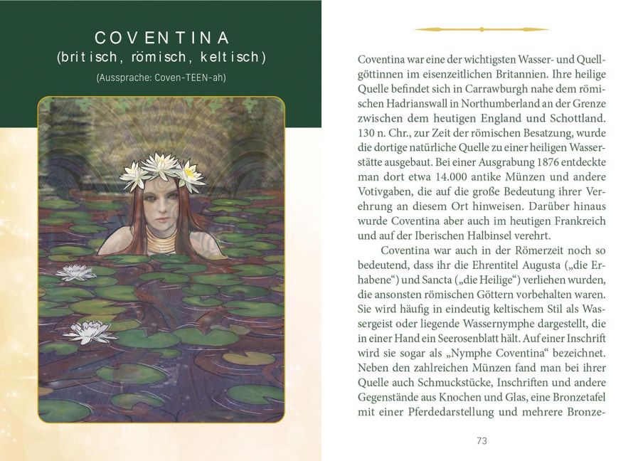 Dieses Orakel schöpft aus dem tiefen Brunnen der Weisheit keltischer Göttinnen und anderer mächtiger Frauen aus dem keltischen Mythos. Es ist ein Orakel, das mit authentischen und alten Quellen der vorchristlichen keltischen Religion gefülltist, die auf jahrtausendealten Traditionen basieren, die auch heute noch relevant sind. Auf den 40 Karten finden sich eine Reihe verschiedener Frauengestalten mit Fokus auf Natur, Zuhause, Souveränität, Fruchtbarkeit und Tod sowie dieElementargöttinnen des Wassers, des Feuers, der Erde und der Luft.